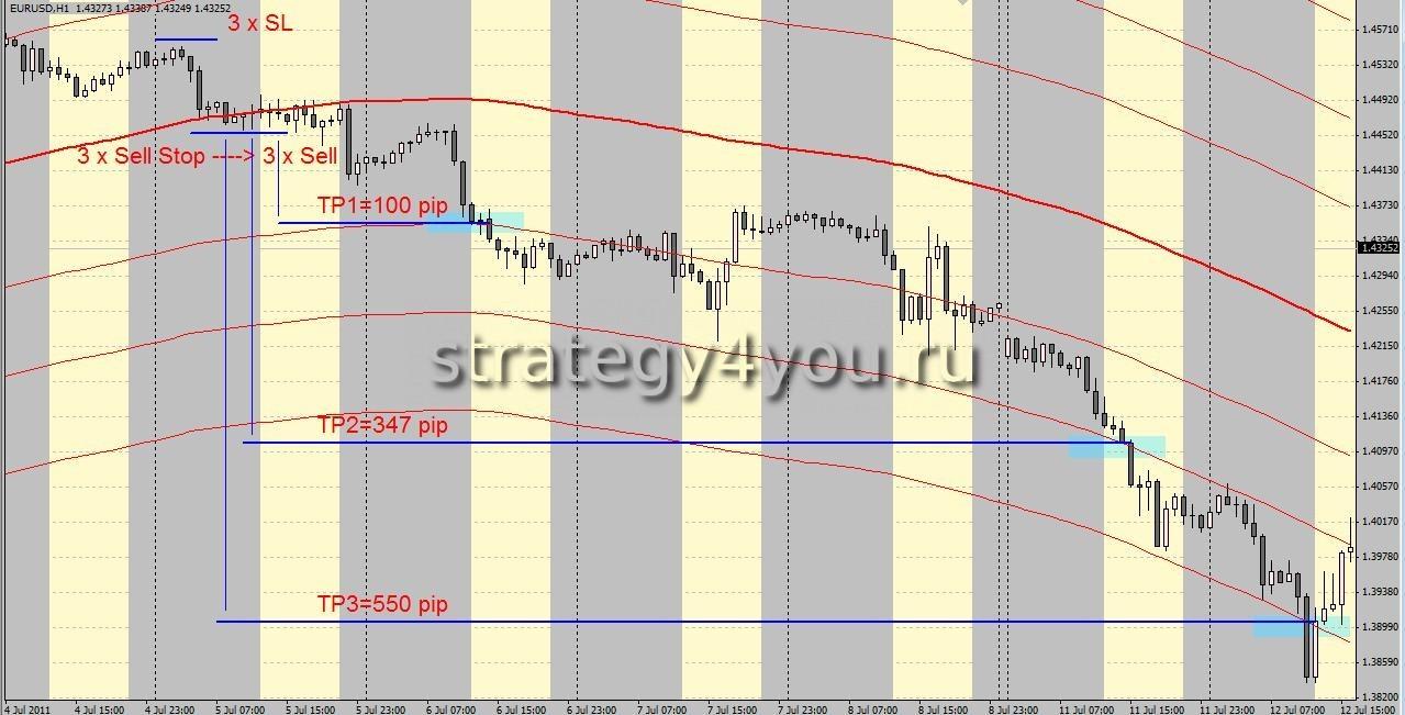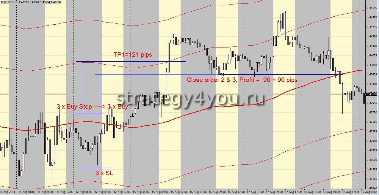 2) Если цена именно на рассматриваемых сессиях пробивает мувинг снизу вверх, даже если возвращается в обратную сторону пробоя (под мувинг), выставляем 3 отложенных ордера Buy Stop равным лотом выше хая азиатской + тихоокеанской сессии, при желании с отступом 5-10 пунктов