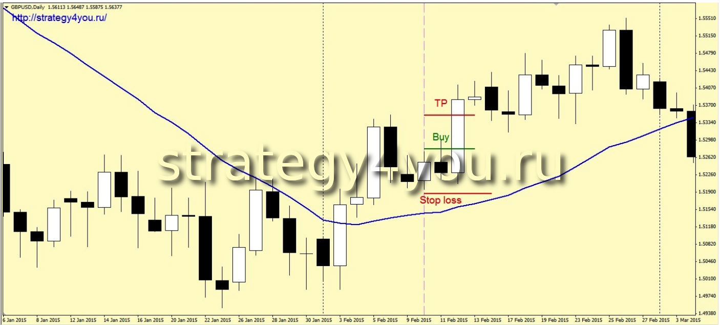 2) Далее, как только формируется белая свеча, мы устанавливаем ордер Бай-стоп выше максимума последней дневной свечи на 2 пункта + спред по данной валютной паре.