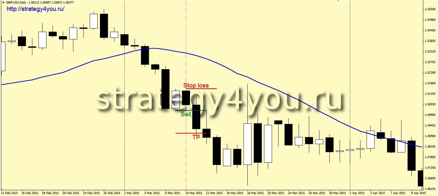 2) После того, как только формируется белая свеча, мы устанавливаем ордер Селл-стоп ниже минимума последней дневной свечи на 2 пункта + спред по данной валютной паре.