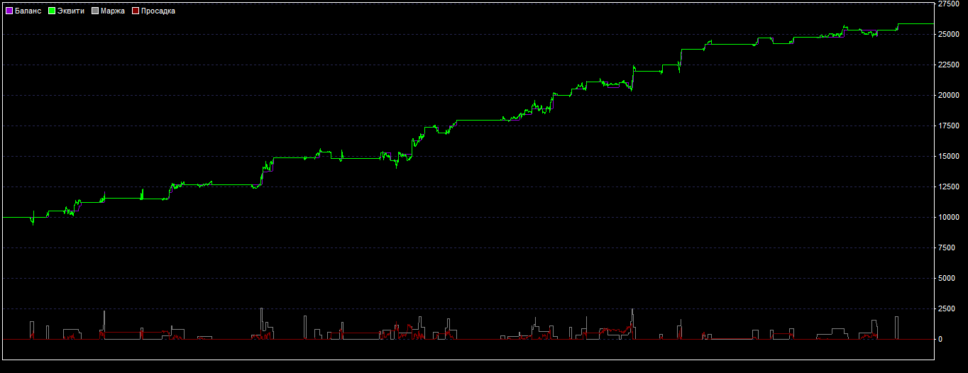 В данной стратегии предлагается использовать риск на каждую сделку в 5% в не зависимости от размера стоп-лосс ордера, он иногда бывает равен 200 пунктам, а иногда и всего 30 (для 4-х значных котировок). Таким образом представлять статистику в пунктах по данной стратегии не совсем целесообразно, так как каждый раз объем сделки и цена пункта будут разными.