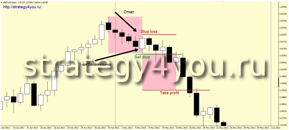 3) Ждем появления первой белой свечи. От максимума до этой свечи должны сформироваться хотя бы 2-3 свечи. Если на момент появления 1-ой белой свечи цена уже ушла очень далеко в сторону нового тренда, то у модели эффективность снижается.