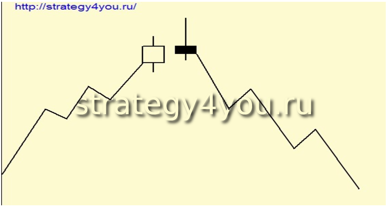 Медвежья модель. На восходящем тренде очередная свеча фиксирует новые максимальные значение, но закрывается ниже цены закрытия предыдущей свечи.
