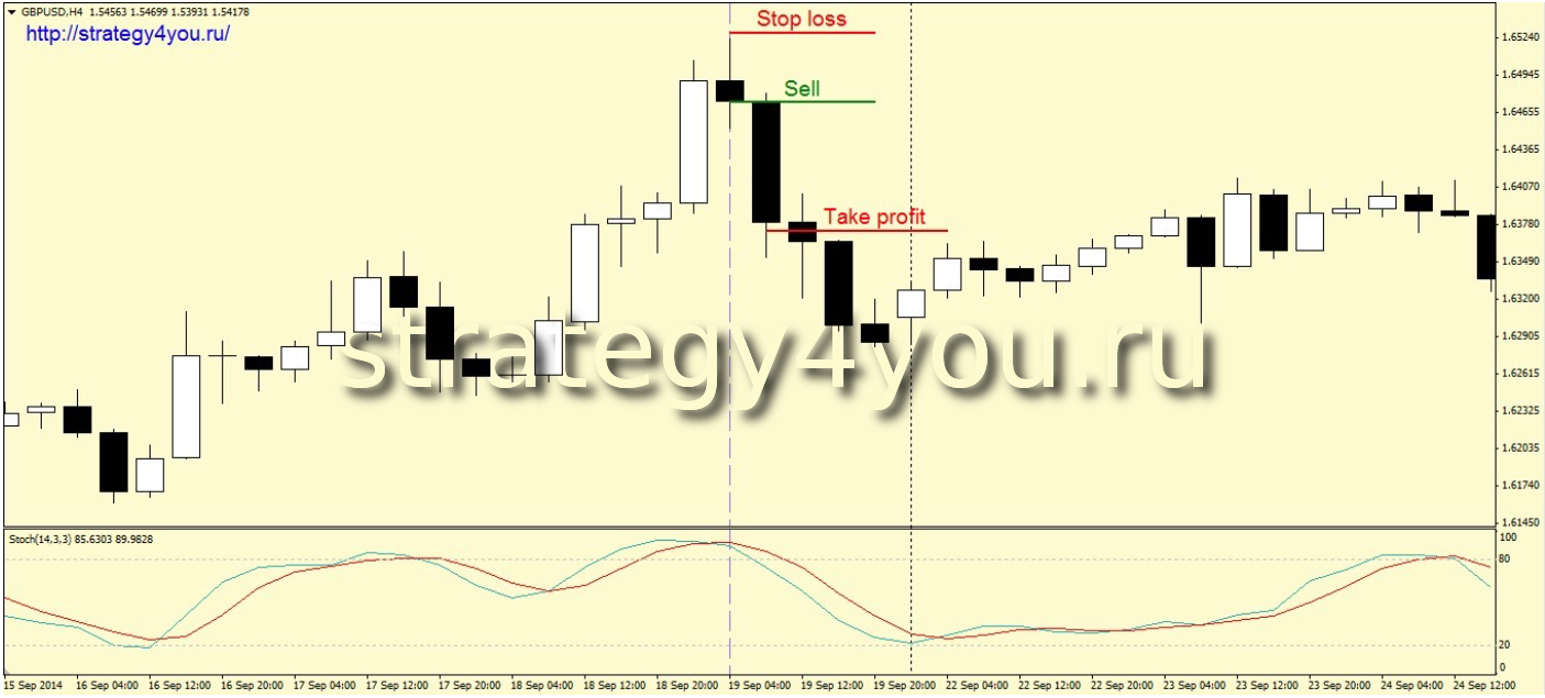 2) Индикатор Stochastic находится в зоне перекупленности (выше своего 80), а сигнальная линия либо касается (слилась) основной линии, либо находится выше неё.