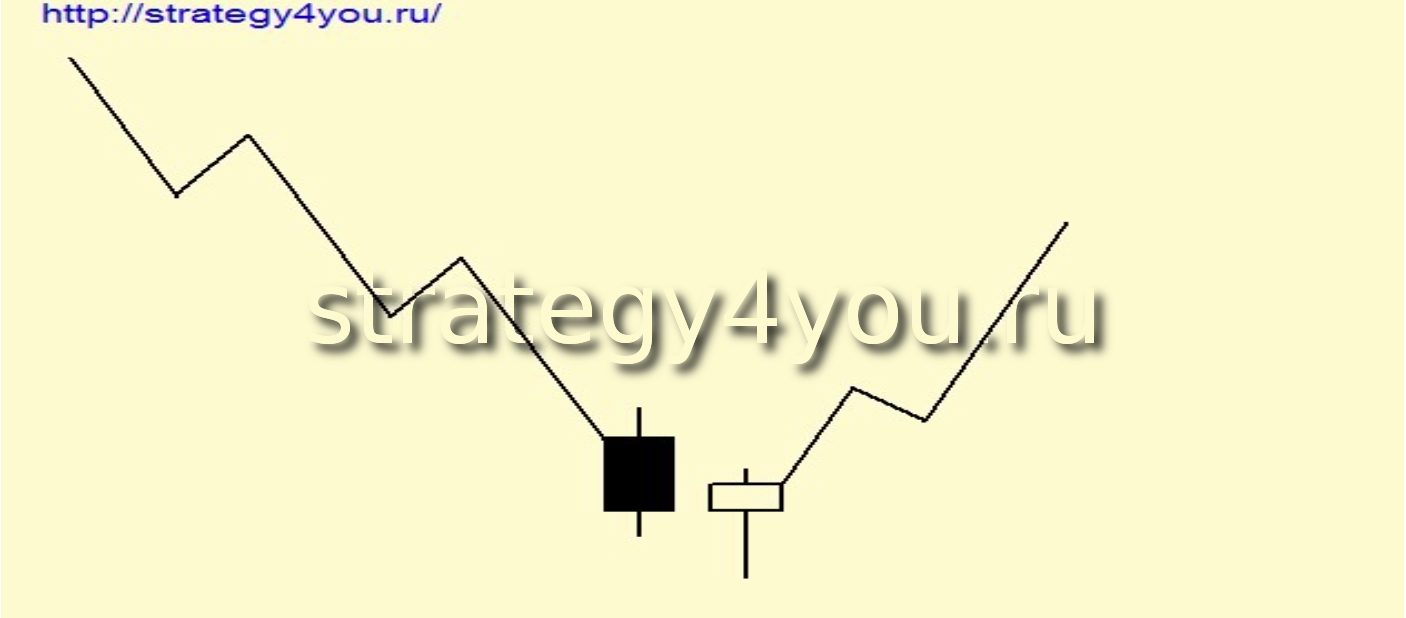 Бычья модель. На нисходящем тренде очередная свеча фиксирует новые минимальные значение, но закрывается выше цены закрытия предыдущей свечи.