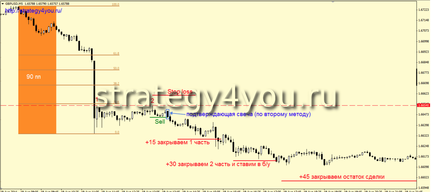 2) После очередного рывка (волны) по тренду, размер которой должен быть не меньше 40 пунктов, начинается коррекция вверх. Её размер не должен превышать уровень фибоначчи от последнего рывка по тренду 38,2%, а в идеале и 23,6%.