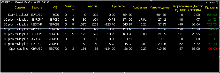 После запуска советник Statistics выводит на график в виде таблицы отчет по торговле каждого советника торгующего на терминале МТ4, по каждой валютной паре или по всем прам вместе.