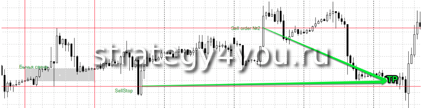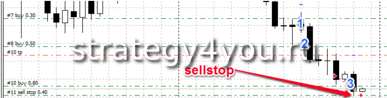 Однако, Если количество открытых ордеров в одном направлении больше 2, то вне зависимости от условий стратегии Trend Reversal мы выставляем локирующий пробойный ордер на границу дневной свечи по направлению тренда (против открытых ордеров):