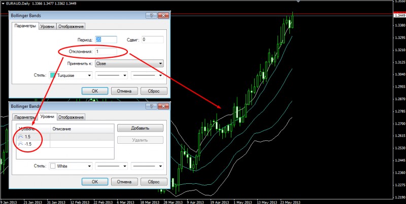 В MT4 достаточно повесить один индикатор Bollinger Bands с отклонением 1 и уровнями 1.5 и -1.5… Получится тоже самое, что и с двумя в вышеуказанном описании.