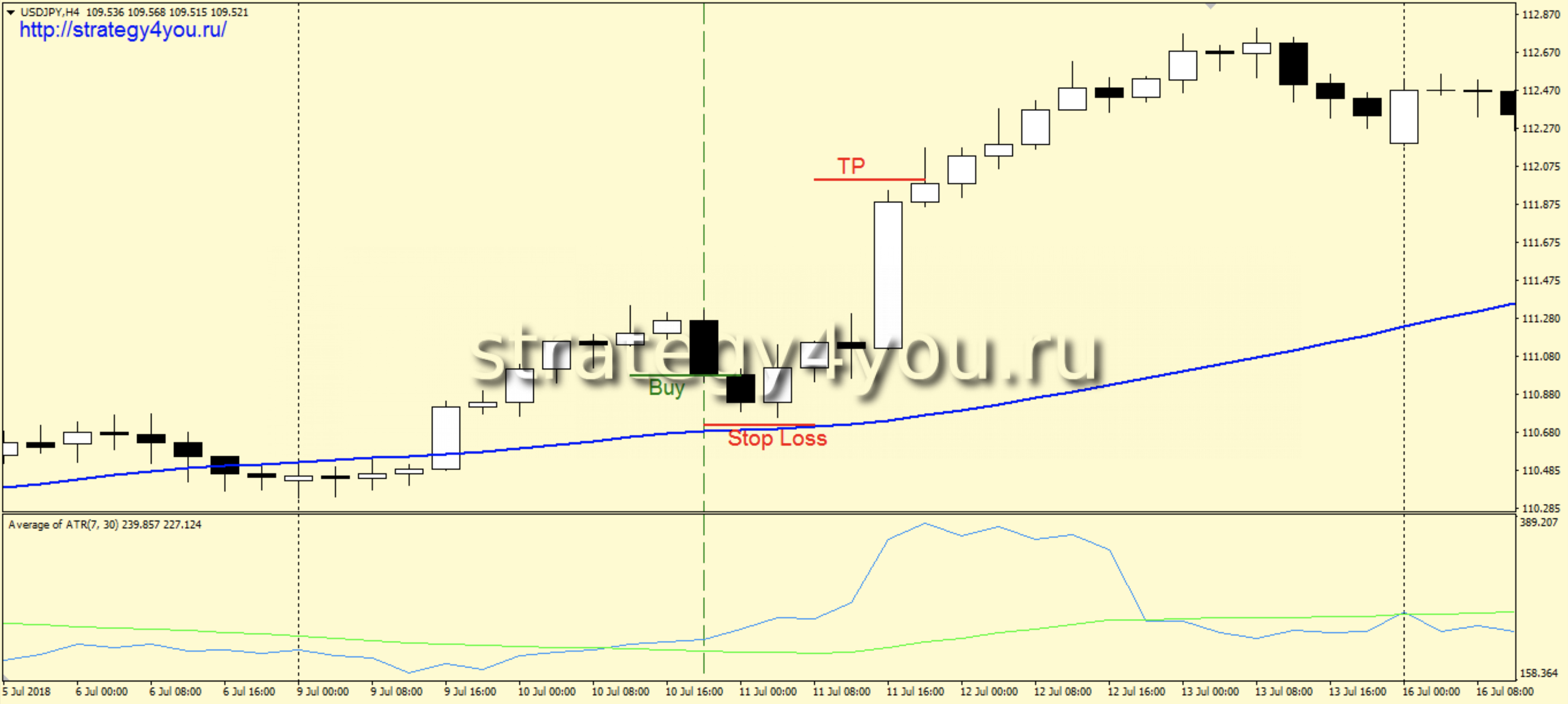 2) Индикатор ATR пересекает свою скользящую среднюю снизу вверх. Каждое такое пересечение позволяет искать только один сигнал в покупку.