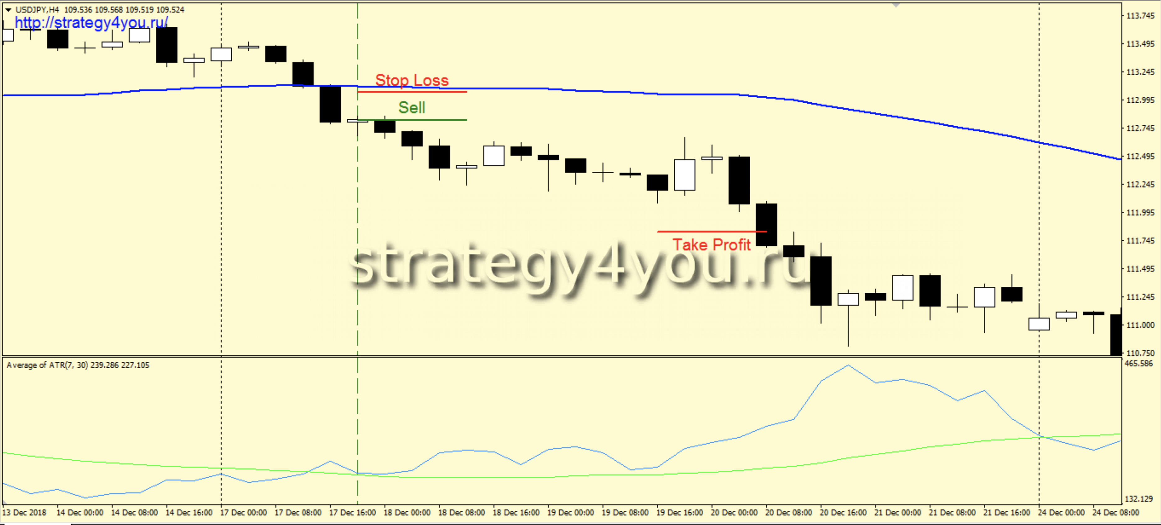 2) Индикатор ATR пересекает свою скользящую среднюю снизу вверх. Каждое такое пересечение позволяет искать только 1 сигнал на продажу.