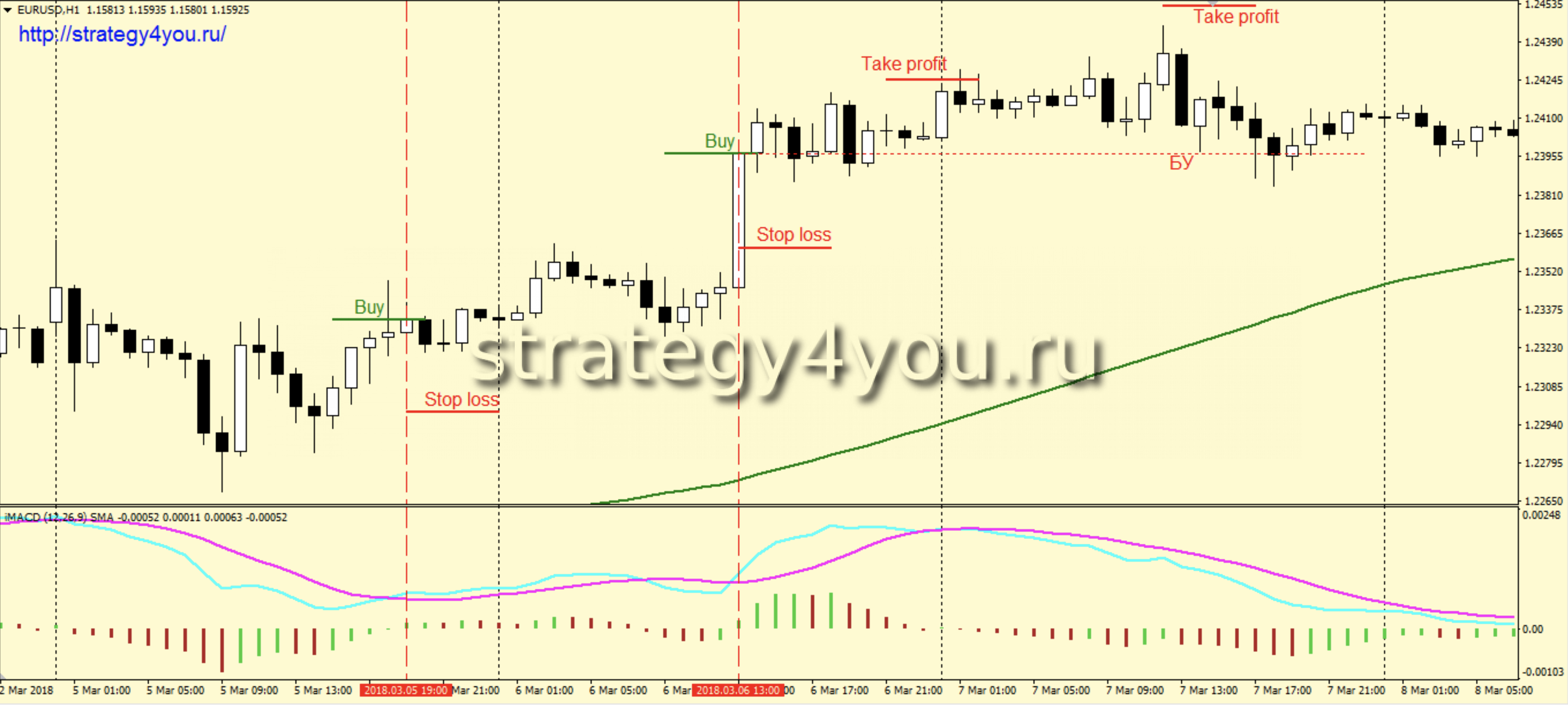 - iMACD с параметрами по умолчанию (скачать можно в конце стратегии)