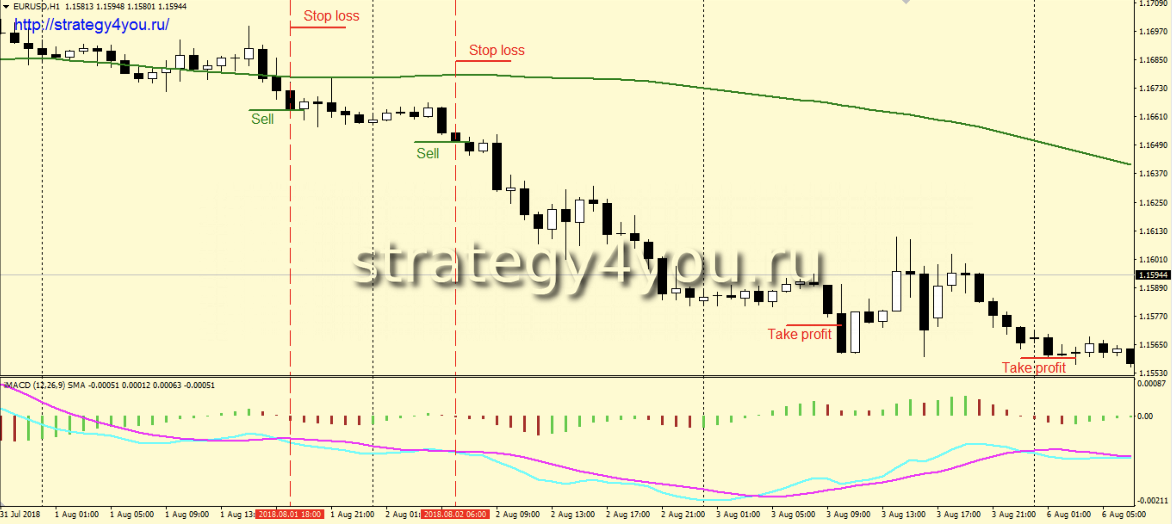 3) На закрытии H1 свечи, на которой получены все, выше описанные сигналы, открывается сделка на продажу.