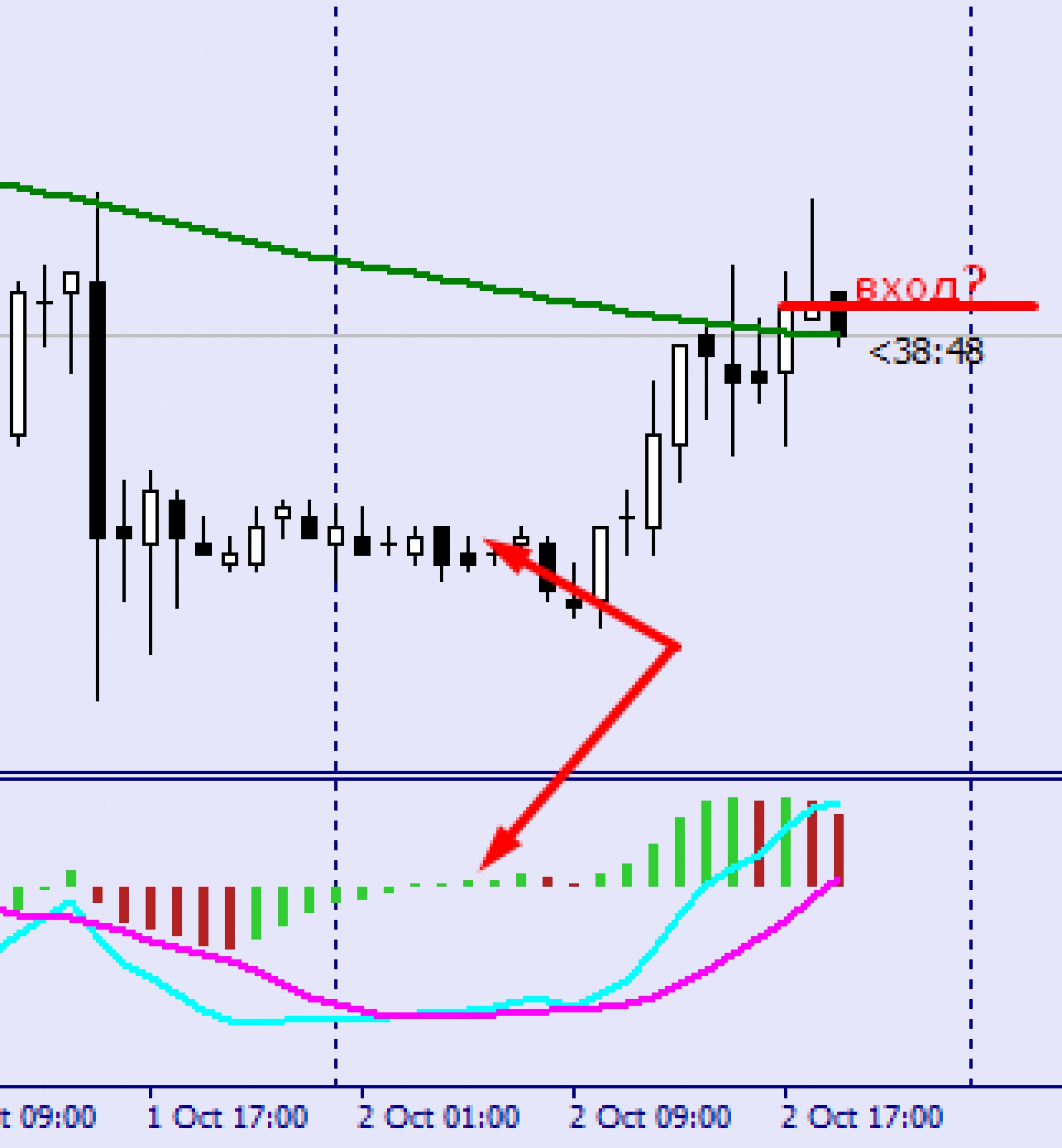 2) В окне индикатора iMACD шкала индикатора опускается ниже «0» отметки и соответственно синяя линия оказывается ниже розовой линии.