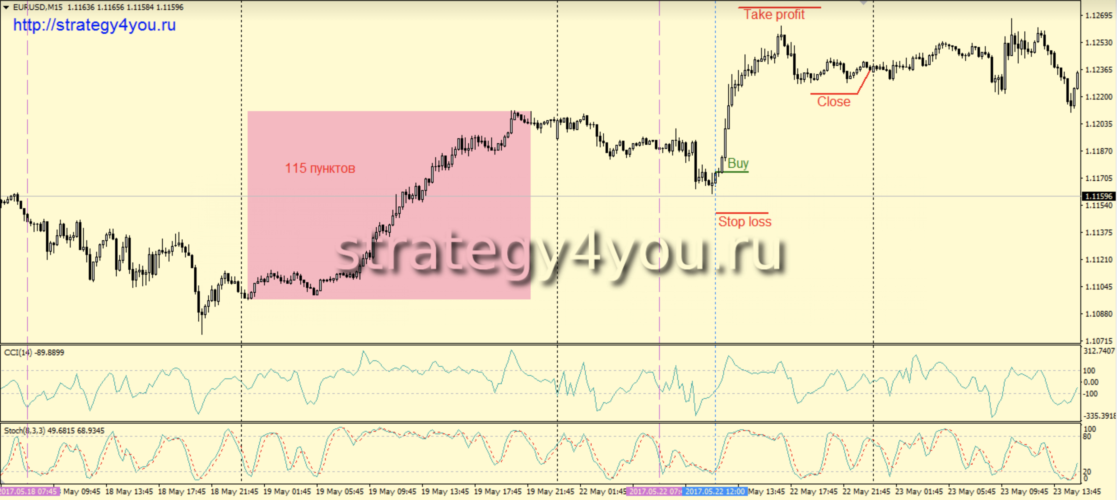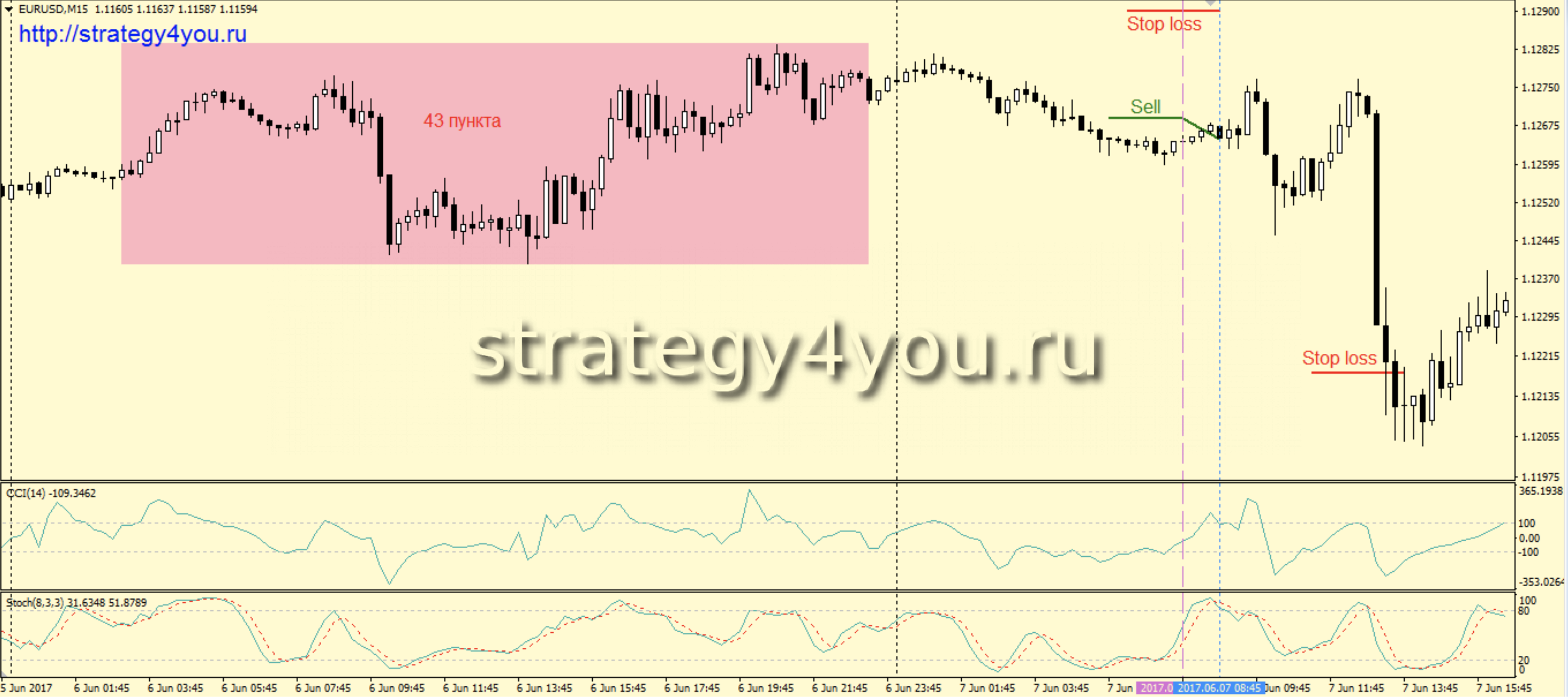 2) Индикатор CCI после нахождения выше уровня 100 на закрытии очередной свечи M15 оказывается ниже этого уровня.
