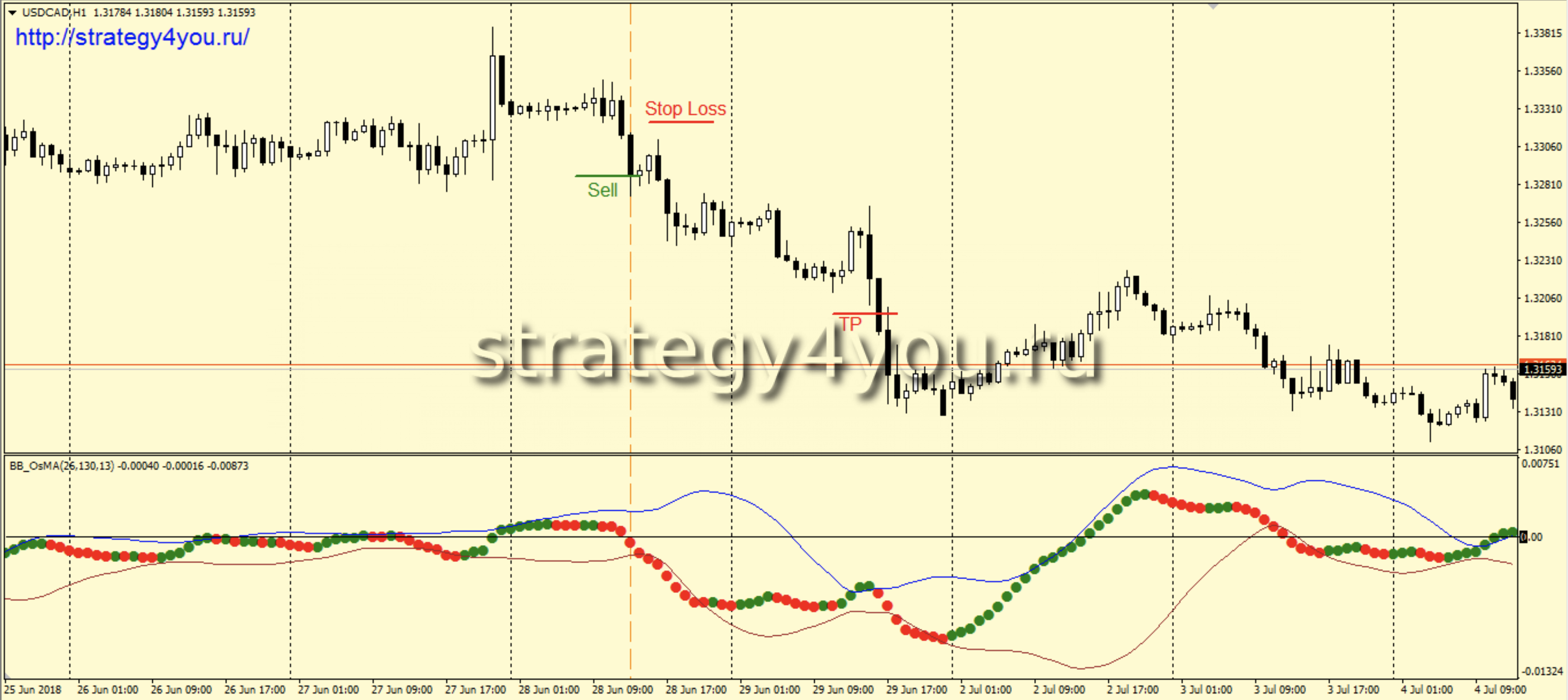 3) Если нижняя линия индикатора еще не достигнута, то на закрытии H1 свечи заключается сделка на продажу.