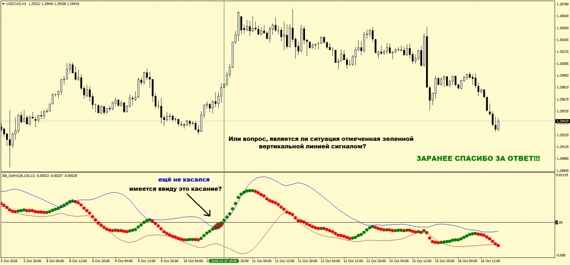 1) Шарик индикатора BB_OsMA находится ниже нулевой отметки.
