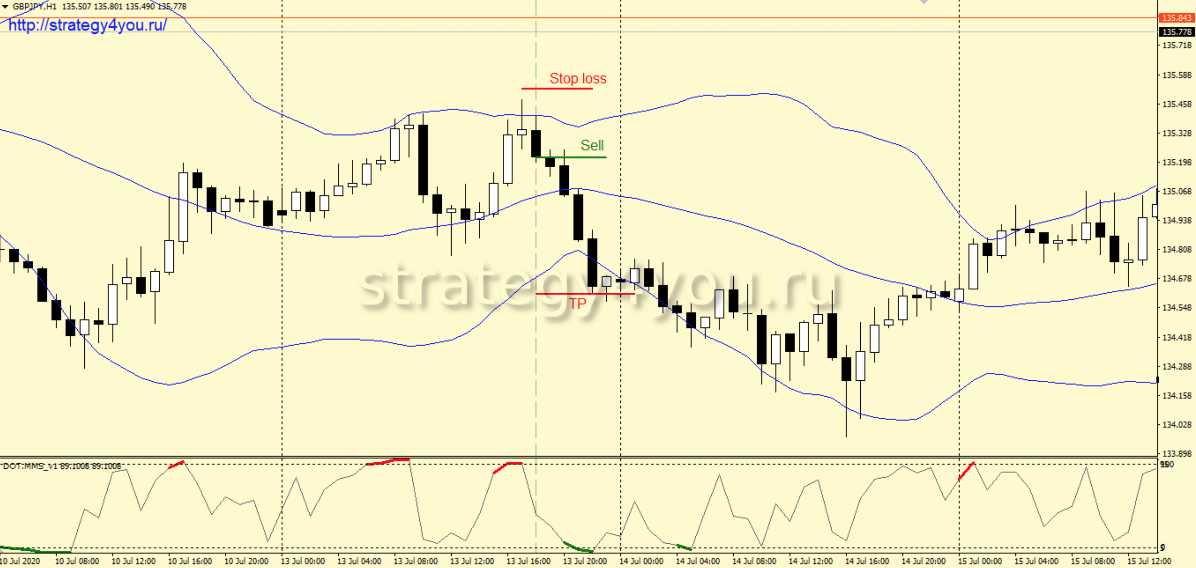 4) Если все условия уже выполнены, то на открытии следующей H1 свечи нужно заключить сделку на продажу.