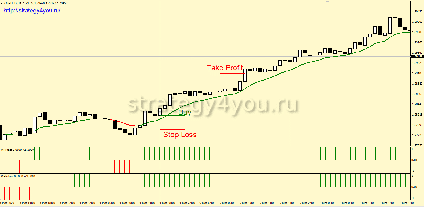 1) После того как один из индикаторов WPR нарисовал красную шкалу следует дождаться момента, когда один из этих же индикаторов (либо оба сразу) нарисуют три подряд зеленые шкалы.