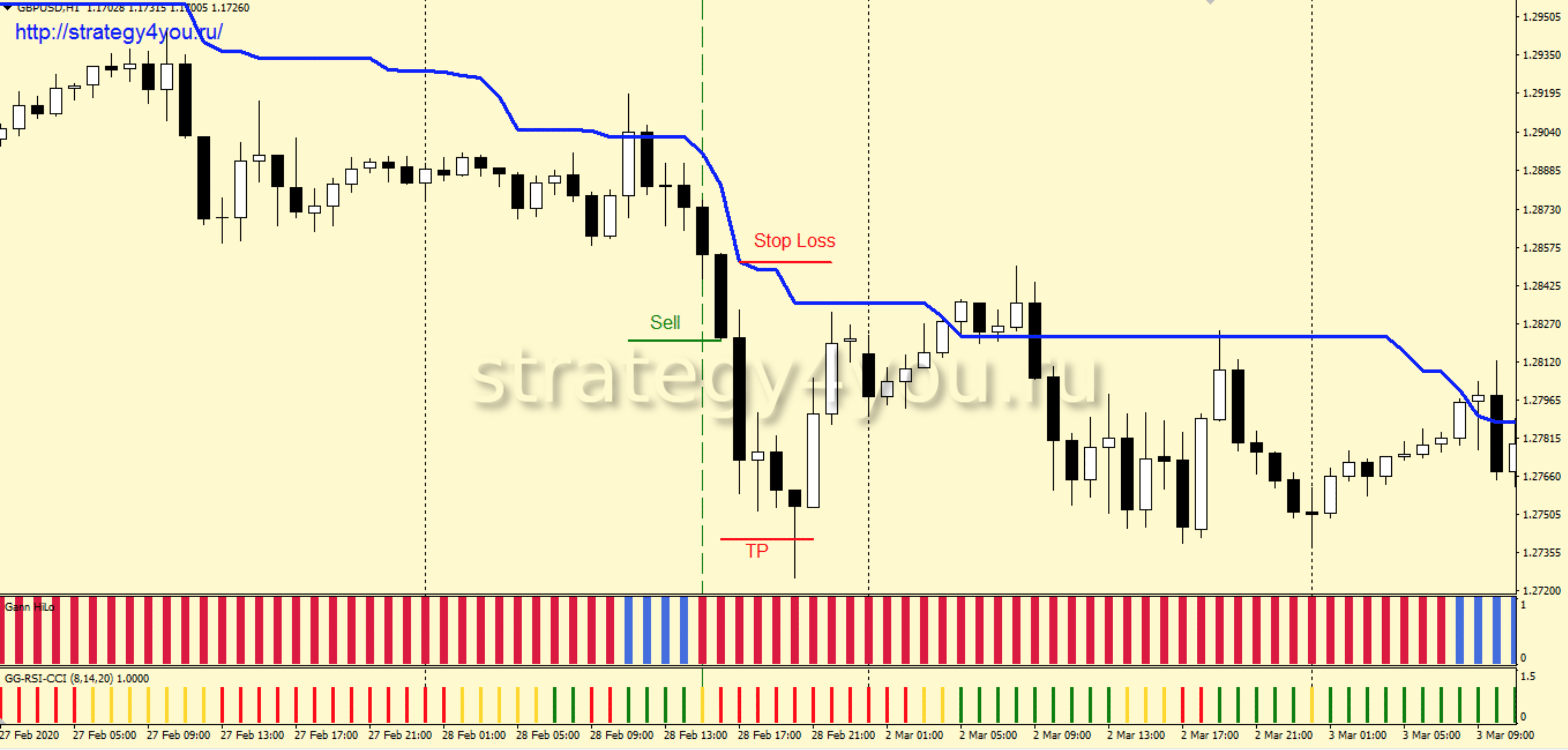 3) Если на этой же часовой свече индикатор GG-RSI-CCI1 окрашен в красный цвет, то на закрытии этой же H1 свечи заключается сделка на продажу.