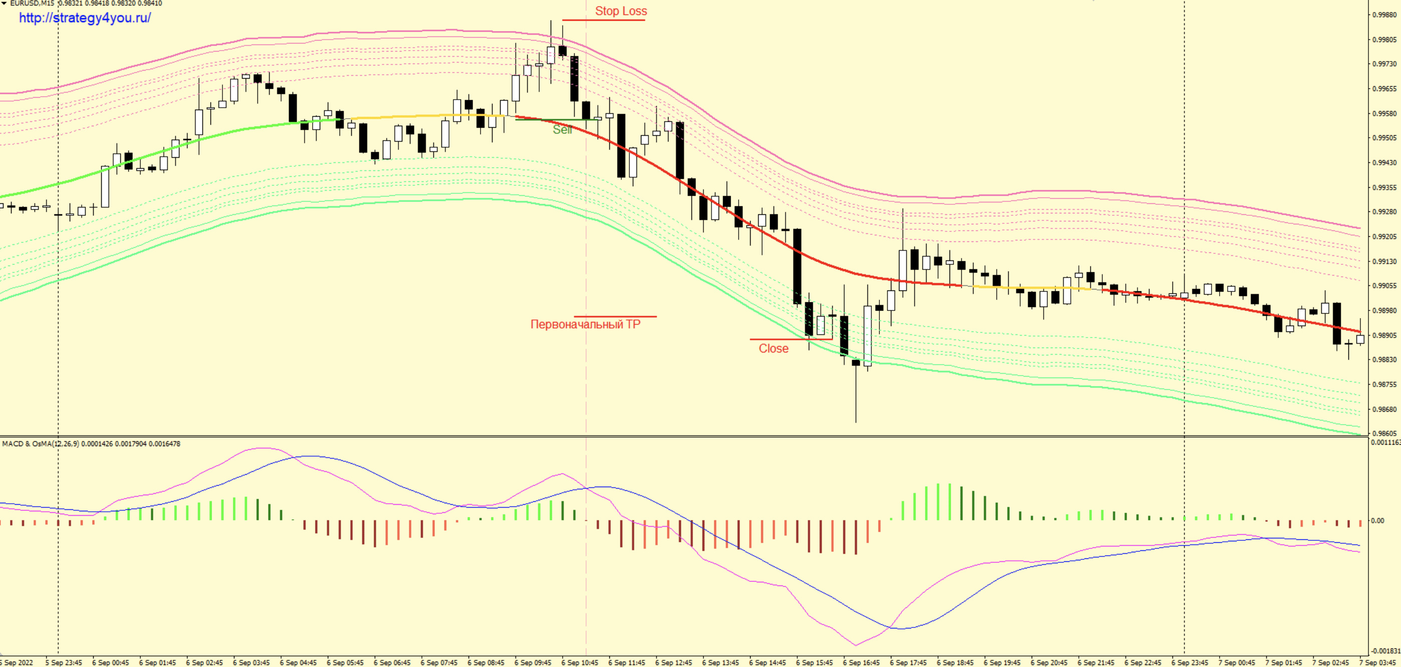 1) Цена коснулась или вышла ниже верхней линии индикатора TMA ATR Chanel. Следующая свеча закрывается сразу ниже 2-х верхних линий этого индикатора.
