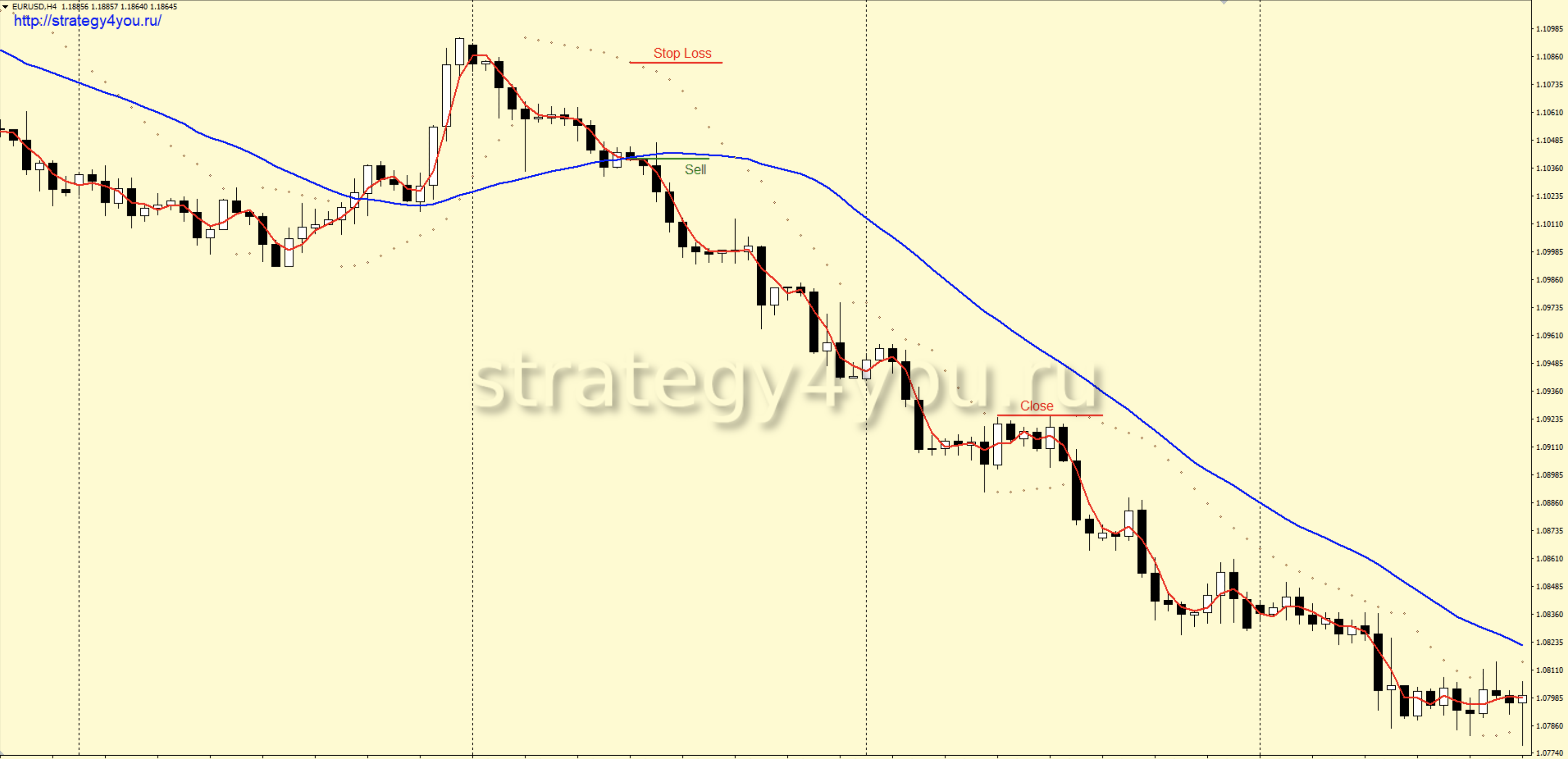 4) Stop Loss ордер устанавливается за соответствующее значение индикатора Parabolic SAR.