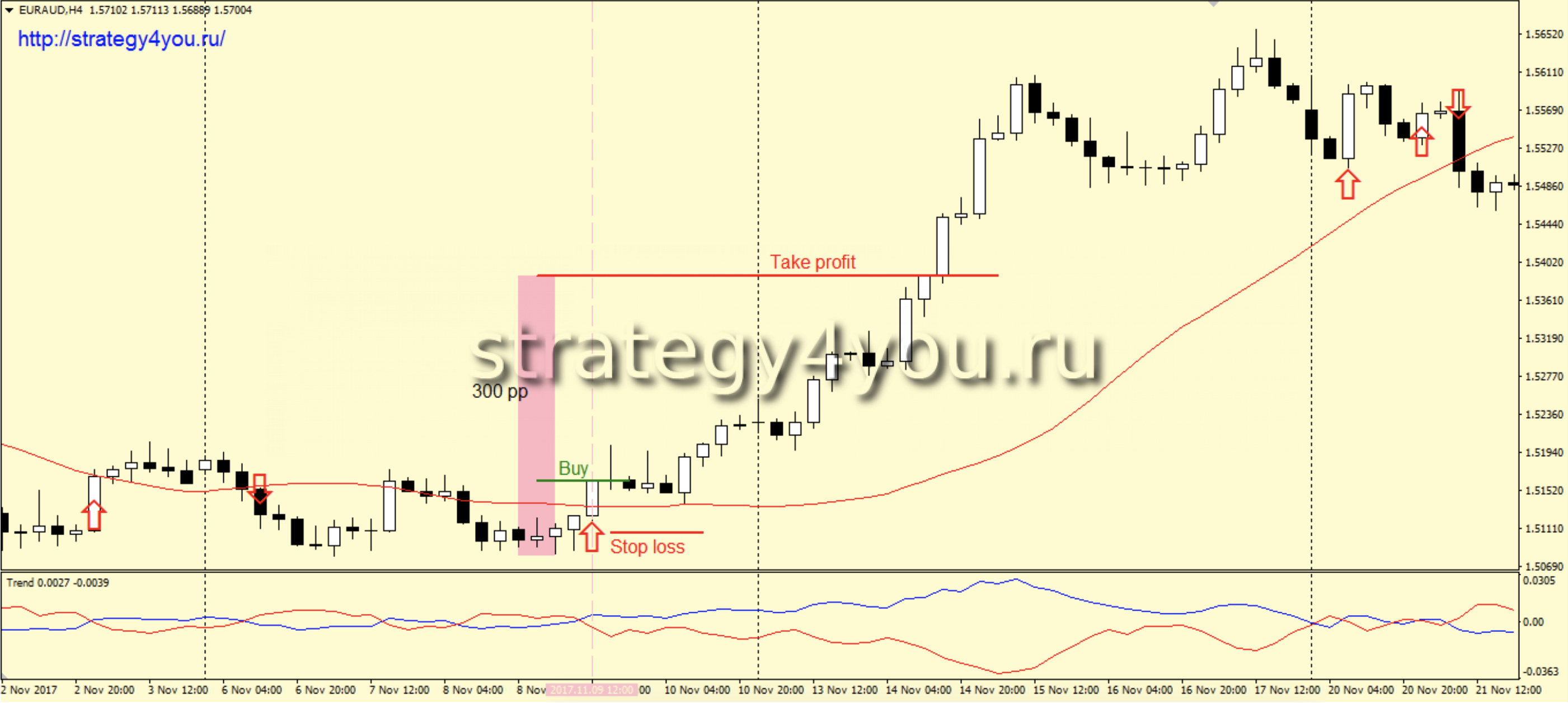 2) Цена закрытия свечи, на которой получен сигнал от индикатора trend находится выше скользящей средней.