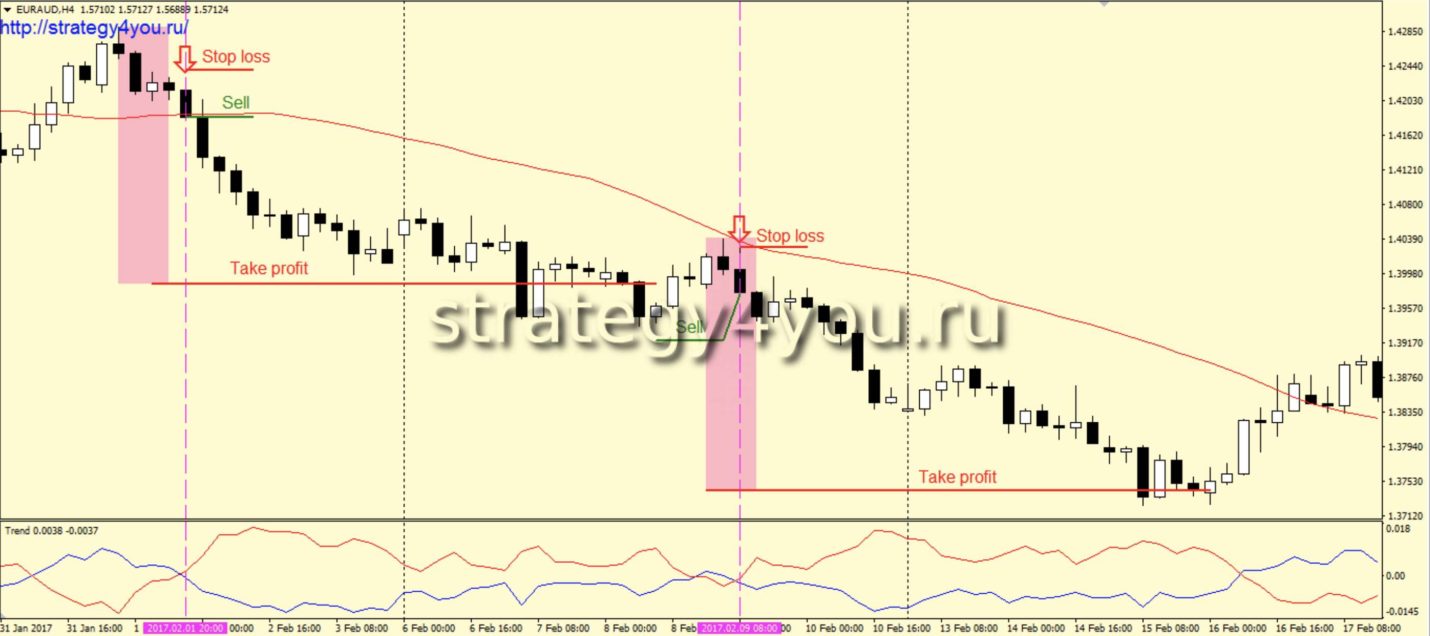 2) Цена закрытия H4 свечи, на которой получен сигнал от индикатора trend находится ниже скользящей средней.