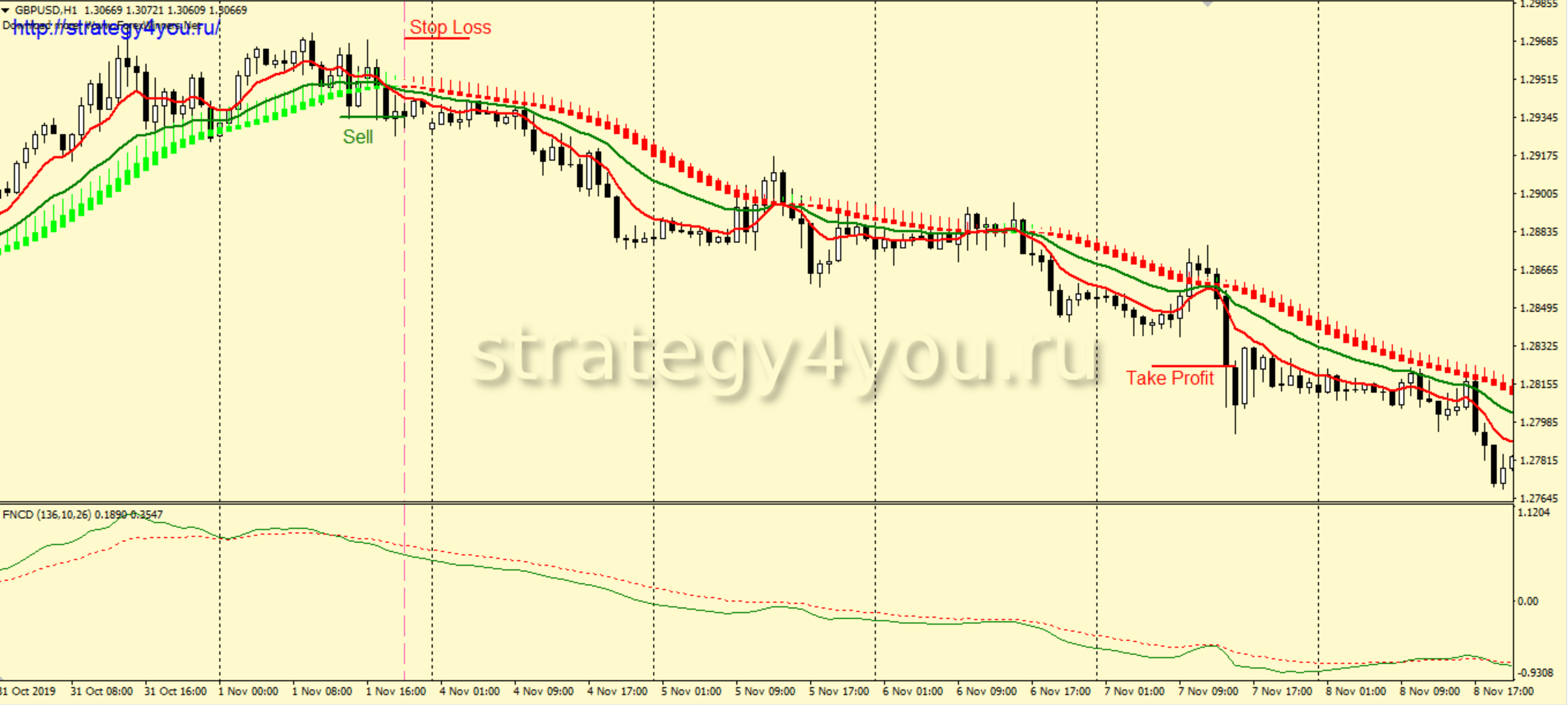 1) Основная линия индикатора FNCD пересекает сверху вниз свою сигнальную линию. Это т факт пересечения должен произойти до остальных сигналов либо вместе с ними, но однозначно не позже. Одно пересечение – получаем один сигнал.