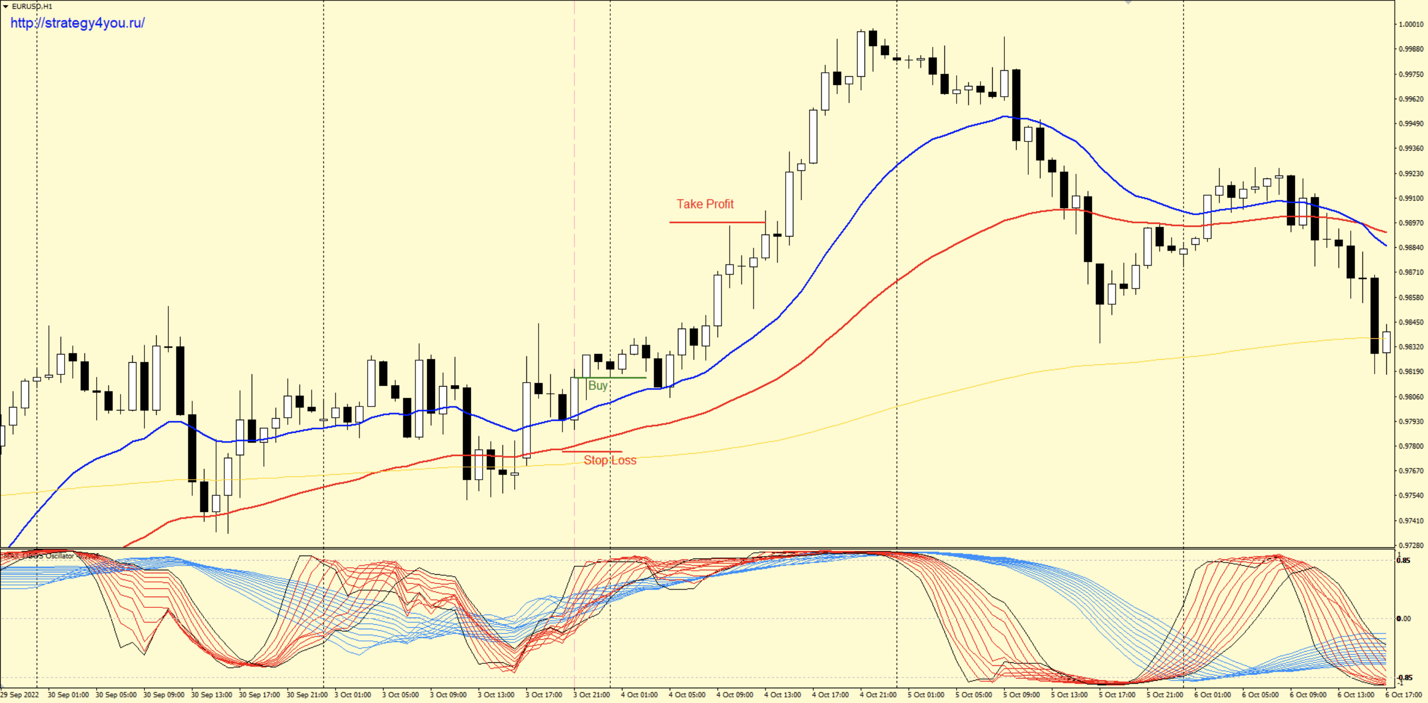 4) Если именно эта же свеча закрывается выше всех скользящих средних, то следует на ее закрытии заключить сделку на покупку.