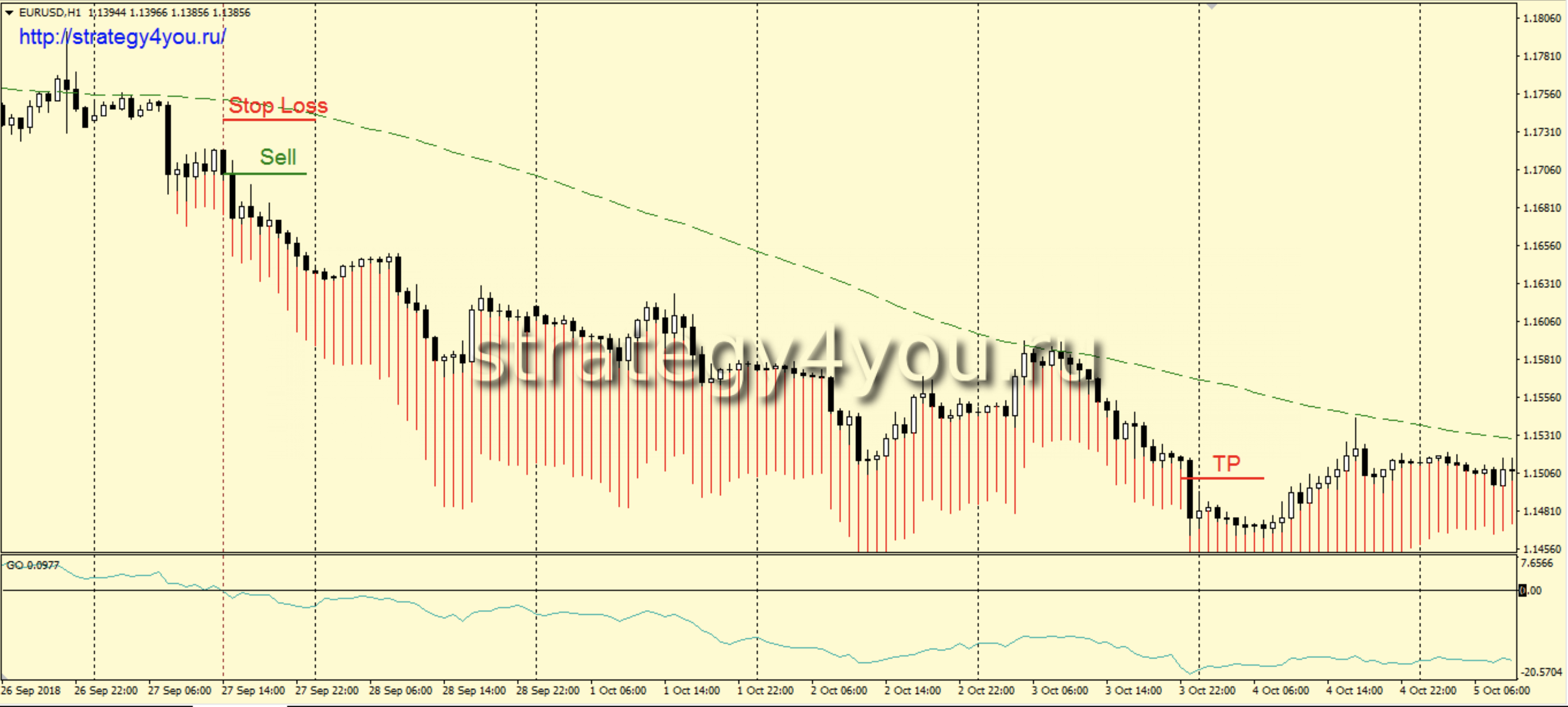 6) Если внутри сделки очередная свеча закрывается под скользящей средней на расстояние от 0 до 40 пунктов — ее не закрываем! А если больше 40 пунктов от точки входа, то сделка закрывается по рыночной цене. В противном случае сделка не закрывается, а ждем следующего выхода ниже скользящей или достижения стоп-лосс/тейк-профит ордера.