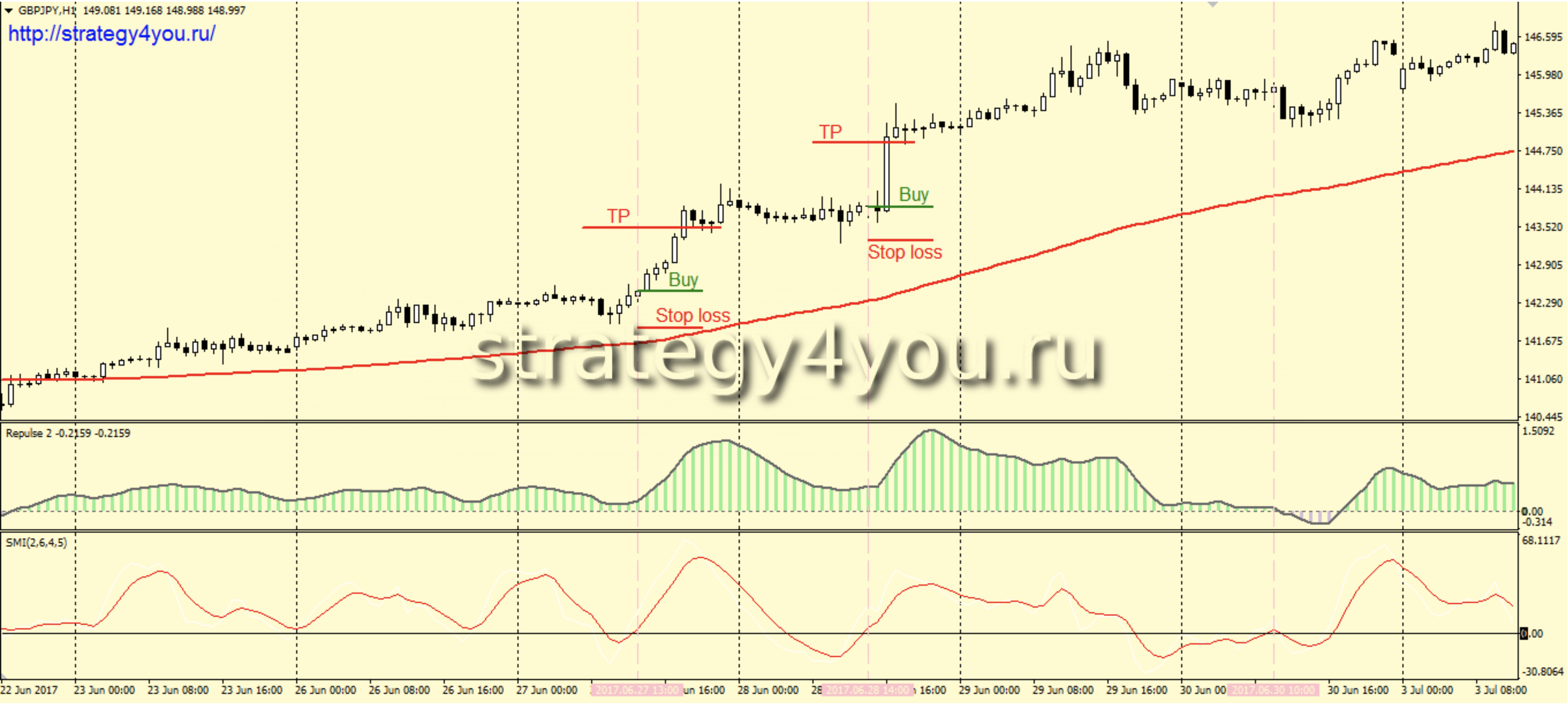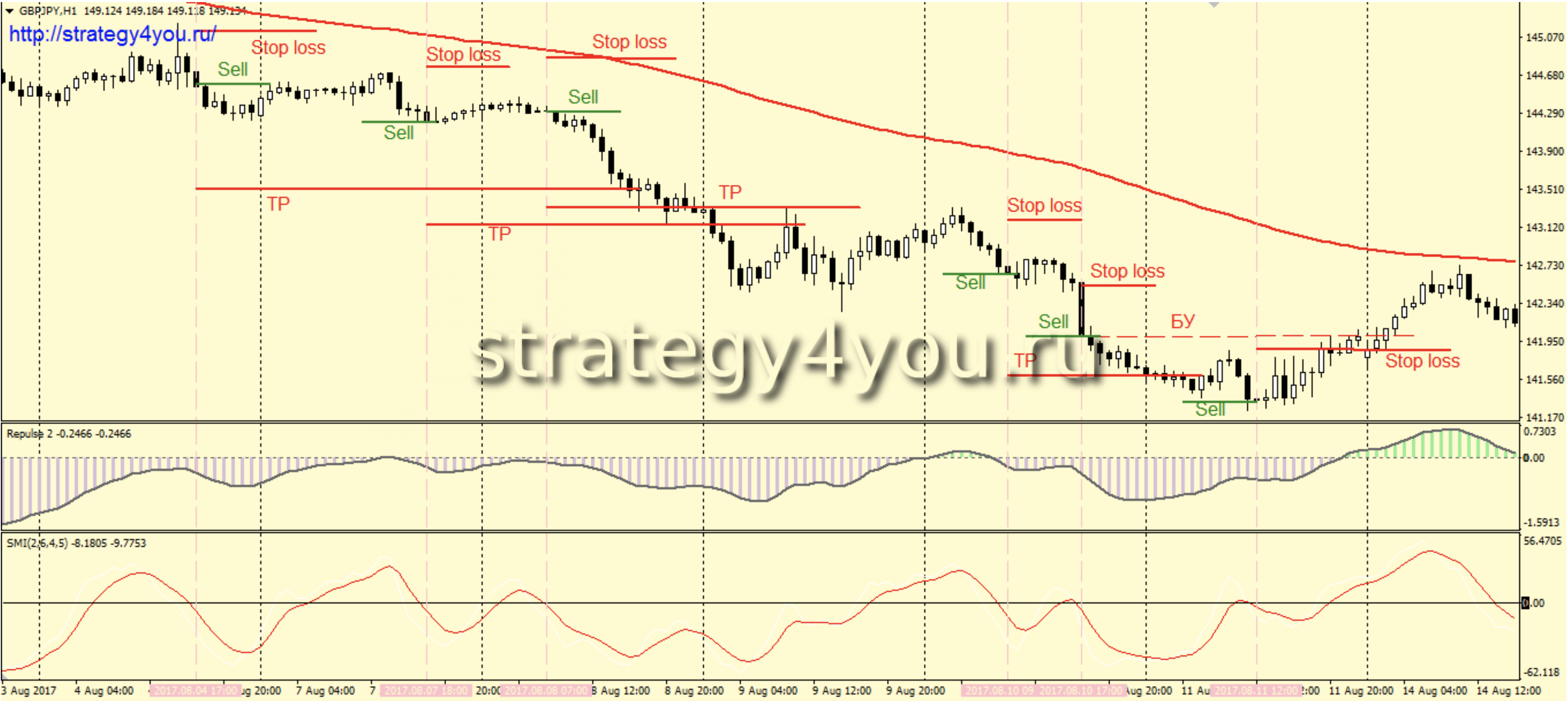 3) Если все выше описанные условия выполнены, то остается дождаться только пересечения индикатором SMI сверху вниз своей нулевой отметки для подтверждения сигнала на вход в рынок.