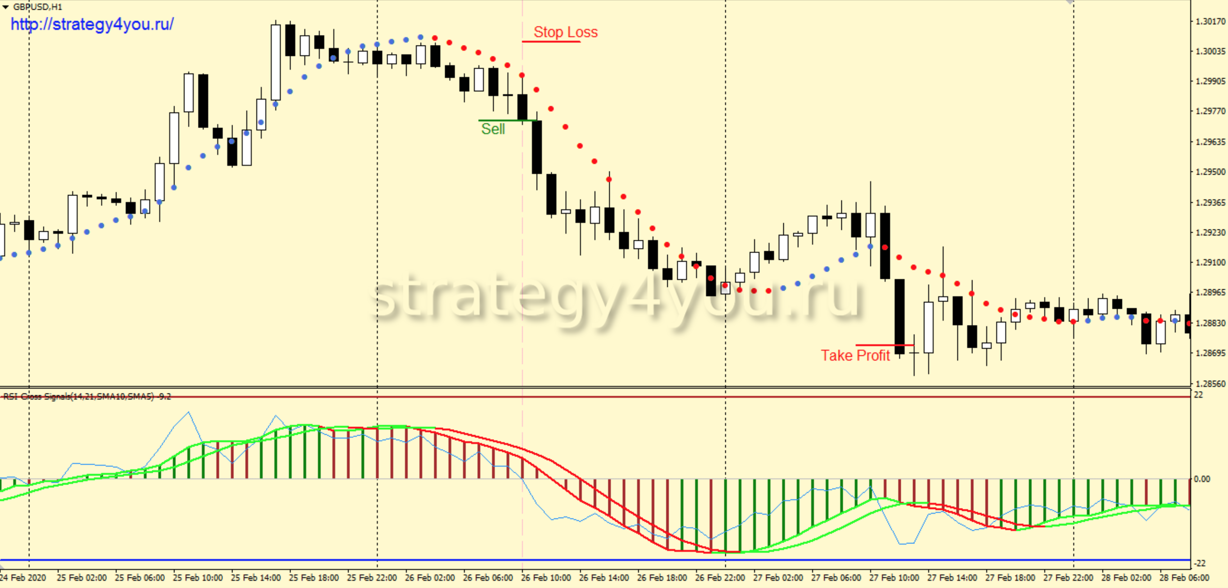 2) На закрытии очередной H1 свечи сигнальная линия индикатора RSISignal (светло-синяя линия) пересекает сверху вниз «0» отметку.