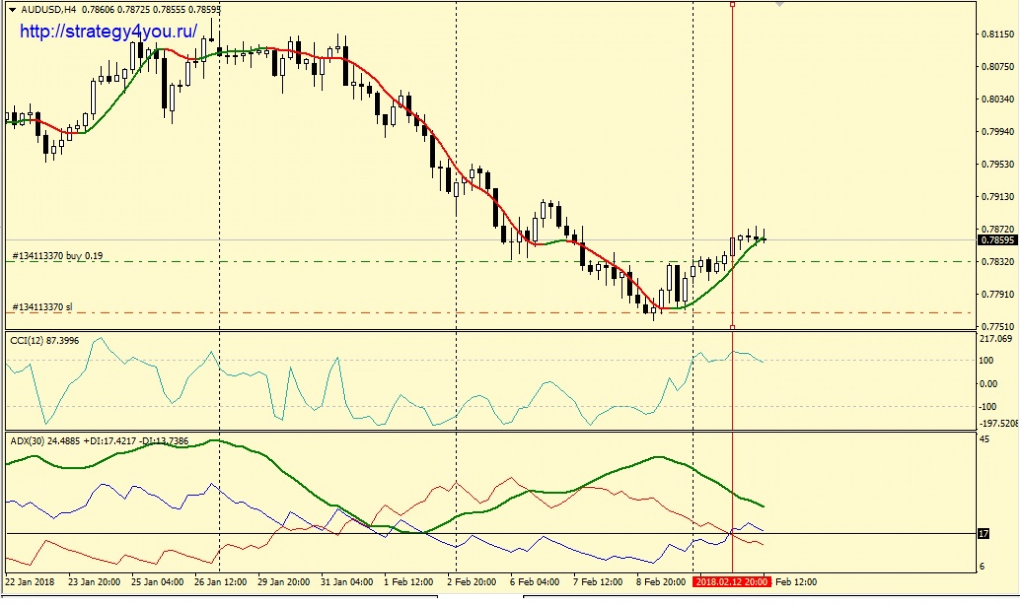 На валютной паре AUDUSD 12 февраля 2018 сформировался сигнал на покупку. Но не было подтверждения от индикатора ADX. Подтверждение от индикатора ADX пришло через несколько свечей (на скрине отмечено красной вертикальной линией). Нужно ли чтобы все условия совпали на одной свече, или допускается чтобы в течение 2-5 свечей? Если допускается, то сколько свечей?