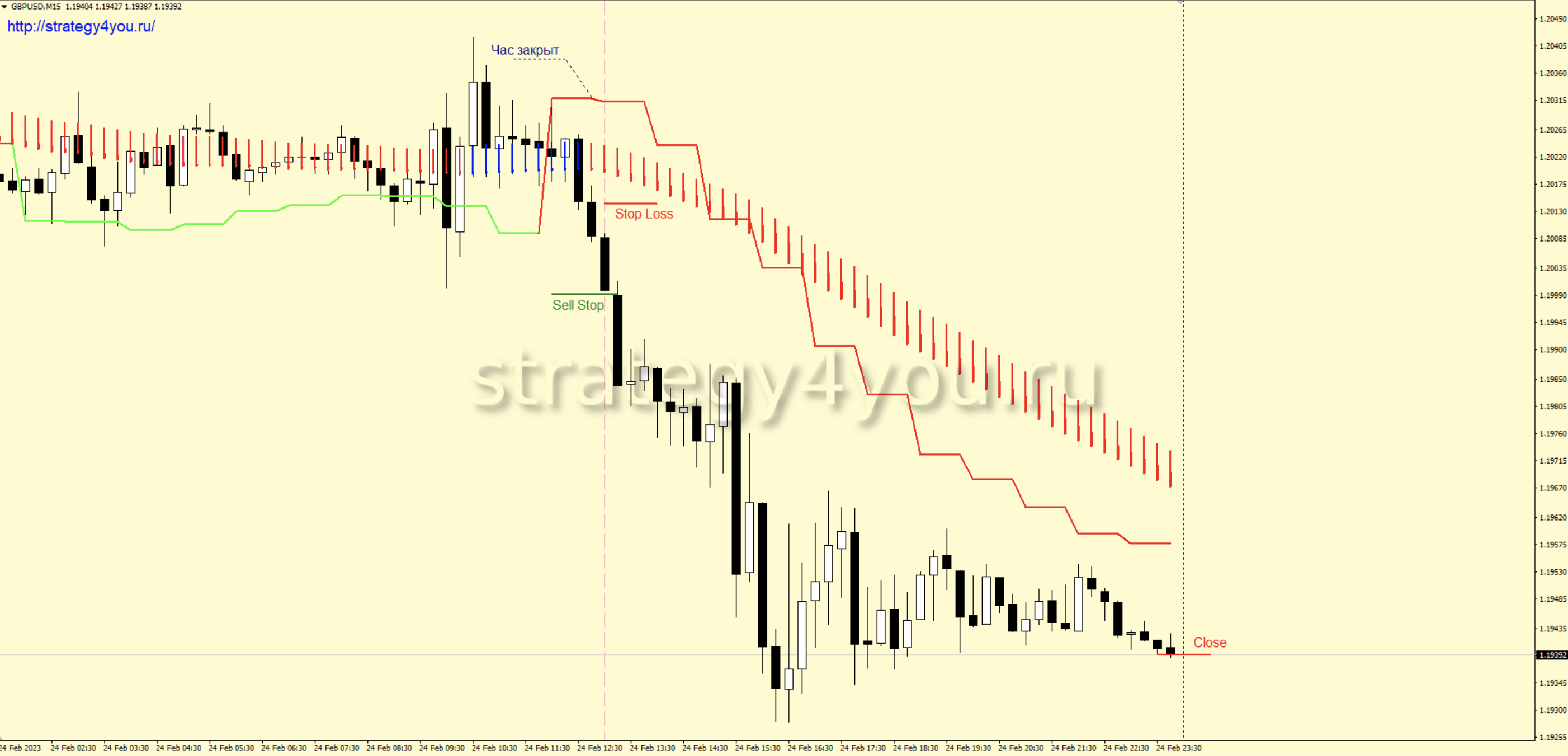 4) Как только все сигналы получены и подтверждены, на пару пунктов ниже минимума последней свечи устанавливается отложенный ордер на продажу — sell stop.
