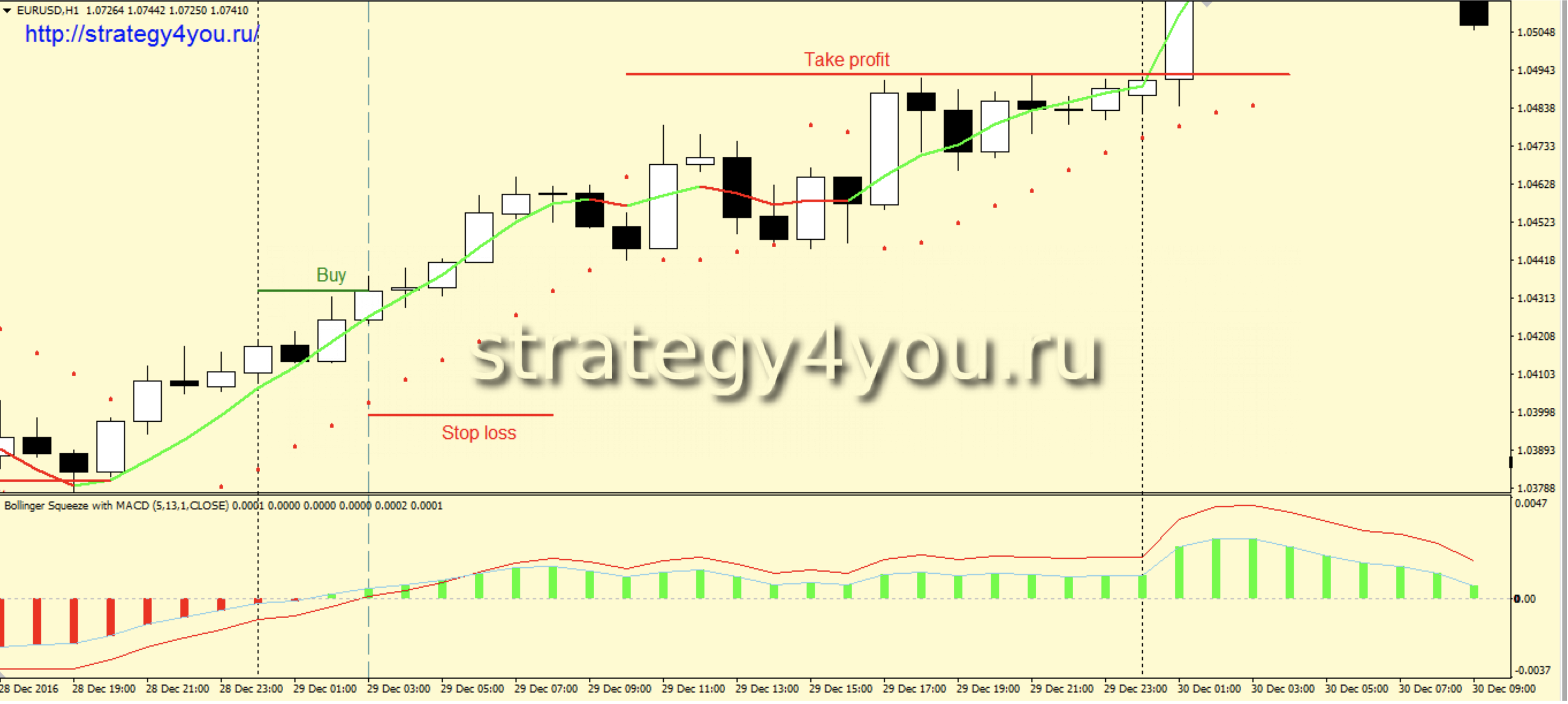 1) На очередной свече шкала индикатора My squeeze light вышла выше своей нулевой отметки. Далее следует дождаться, когда данный индикатор окрасится в зеленый цвет (это может произойти на той же свече). Если смена цвета происходит не на той же свече, что и выход выше нуля, то в этом случае сигнальная свеча должна иметь белое тело. В противном случае не входим.