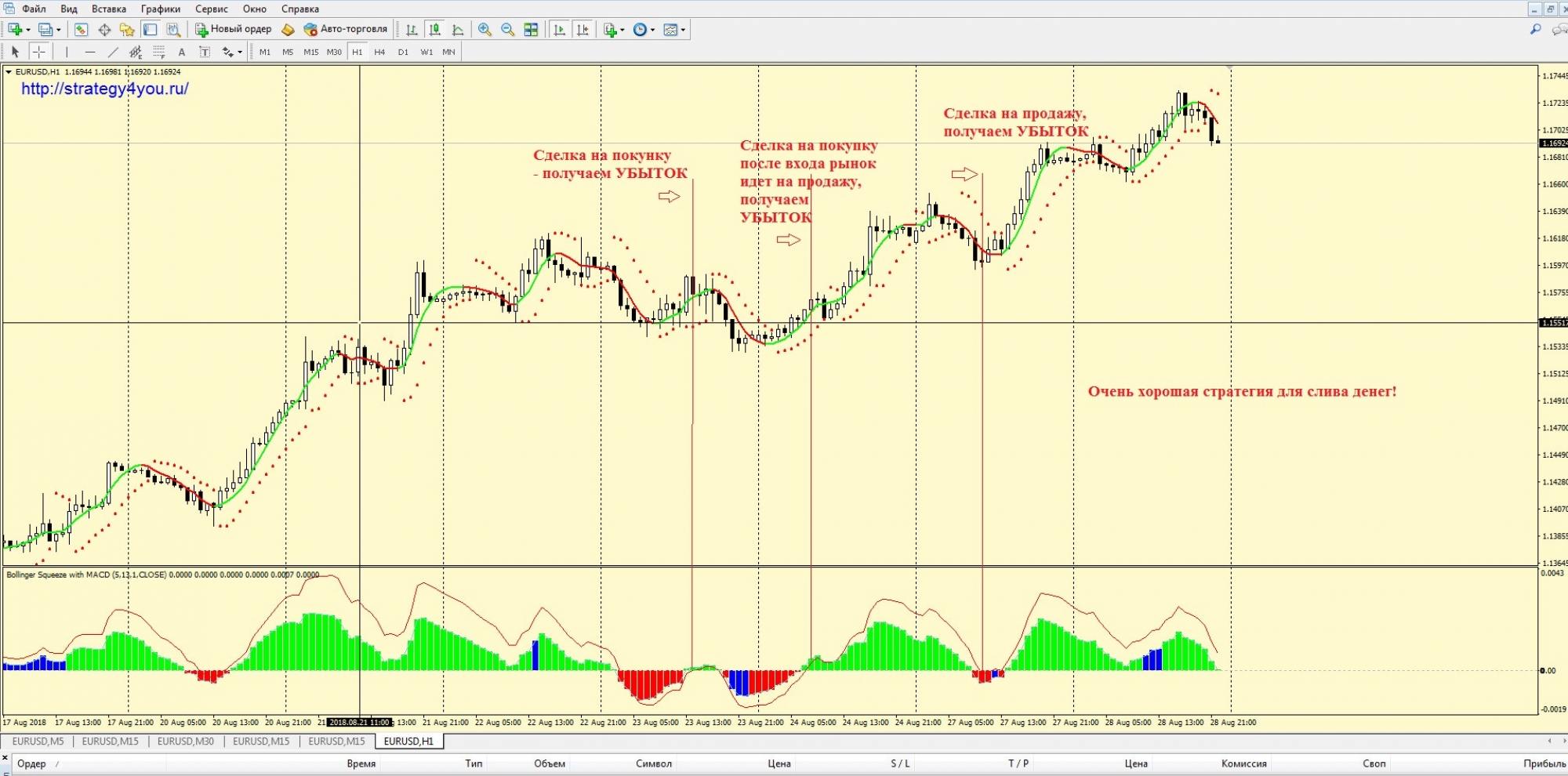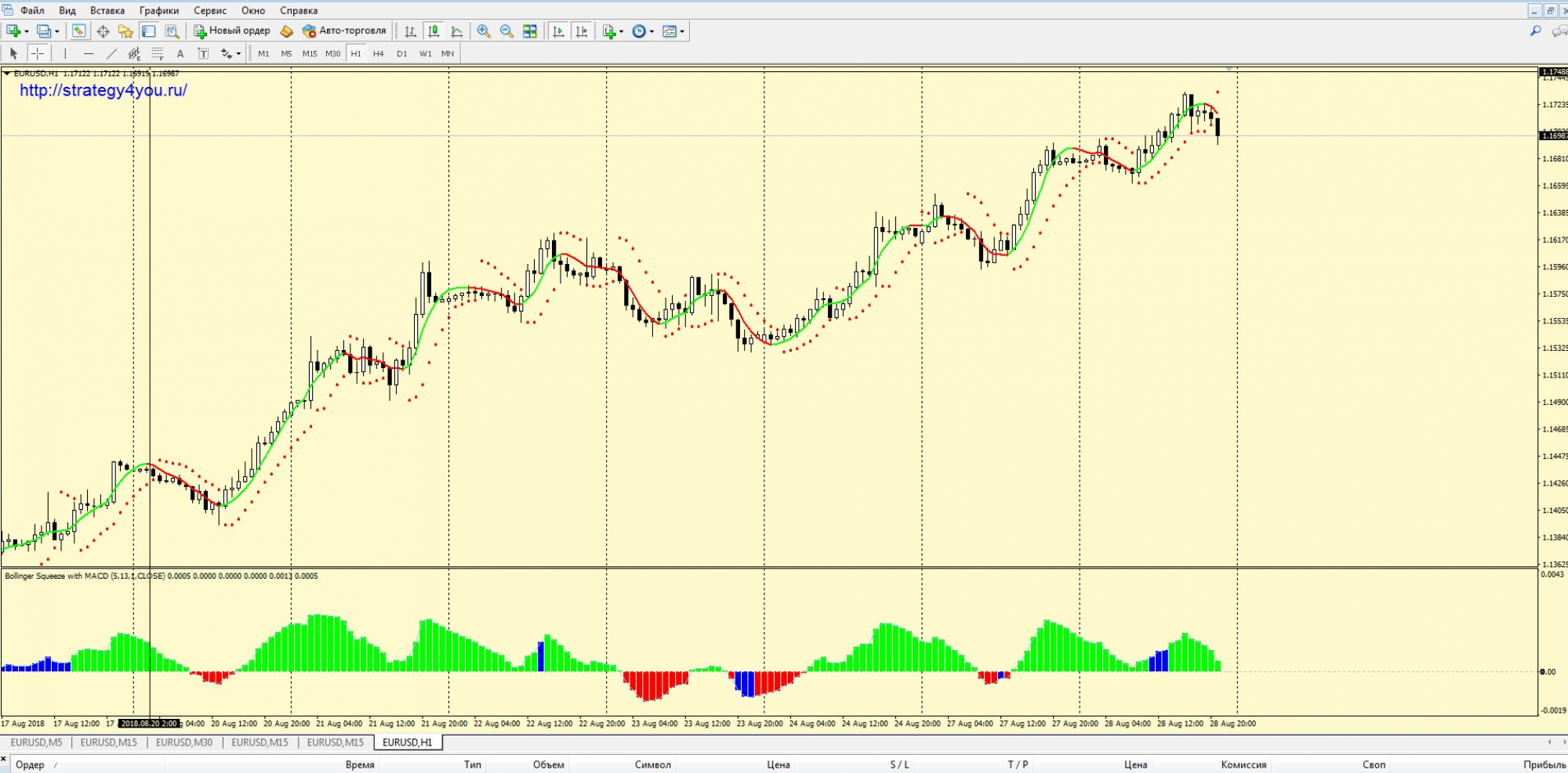 1) После закрытия H1 свечи шкала индикатора My squeeze light опустилась ниже своей нулевой отметки. Ждем момента, когда данный индикатор окрасится в красный цвет (это может произойти на той же свече). Если цвет меняется не на той же, что и выход ниже нуля, то сигнальная свеча должна иметь черное тело. В противном случае в сделку не входим.