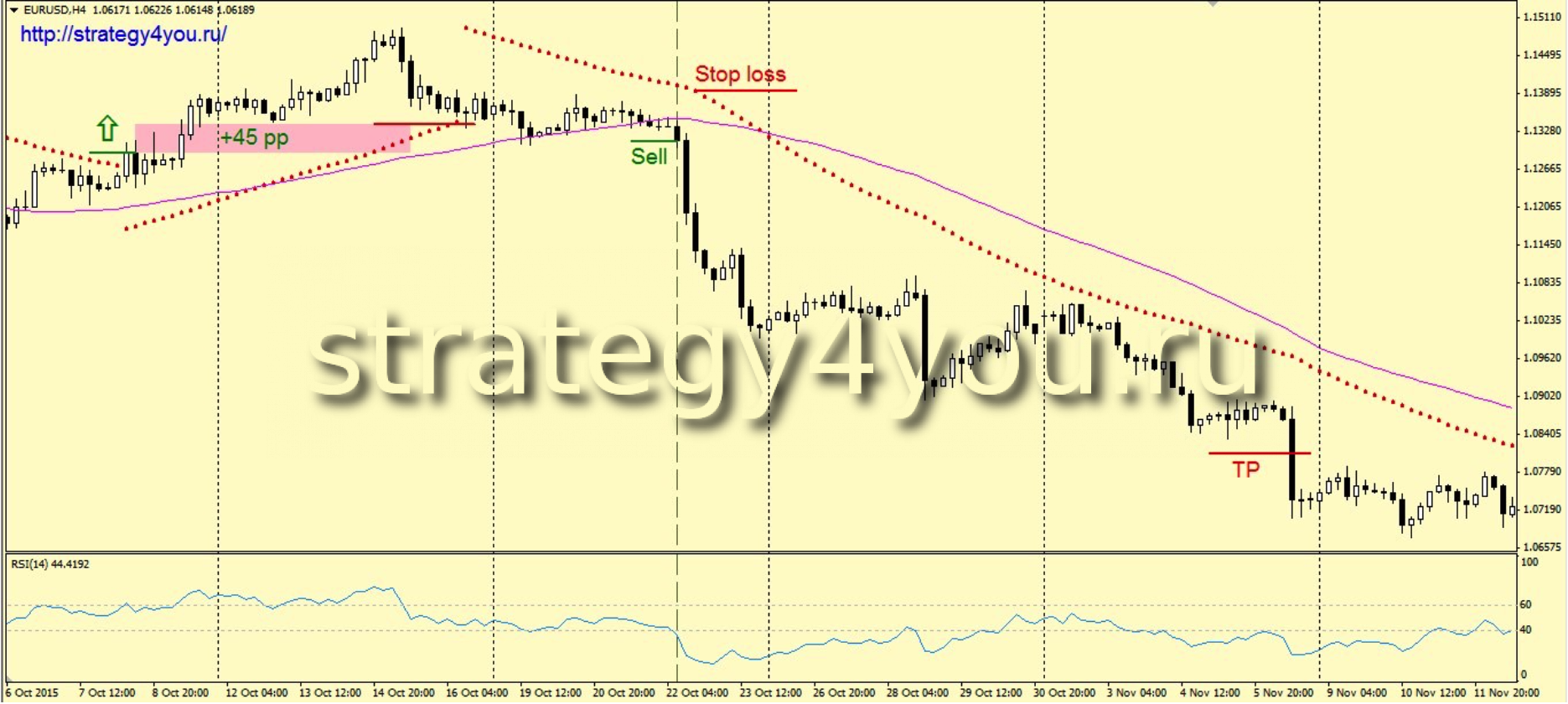 1) Очередная H4 свеча закрывается ниже скользящей средней с периодом 70. Все дальнейшие действия предпринимаются только в том случае, если цена продолжает оставаться ниже МА.