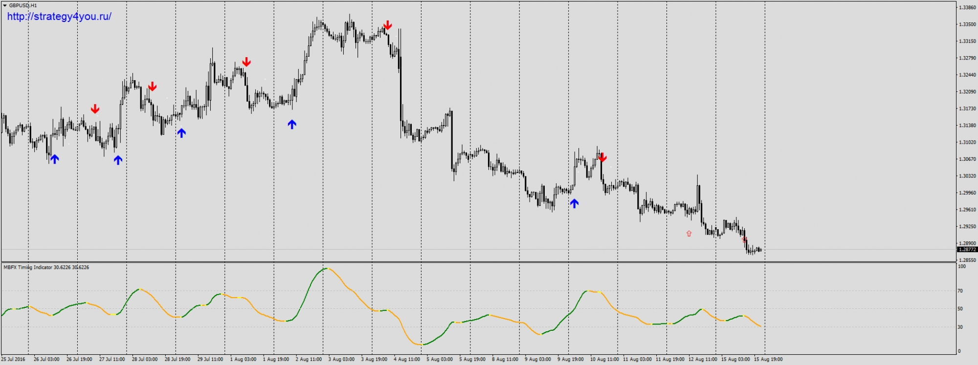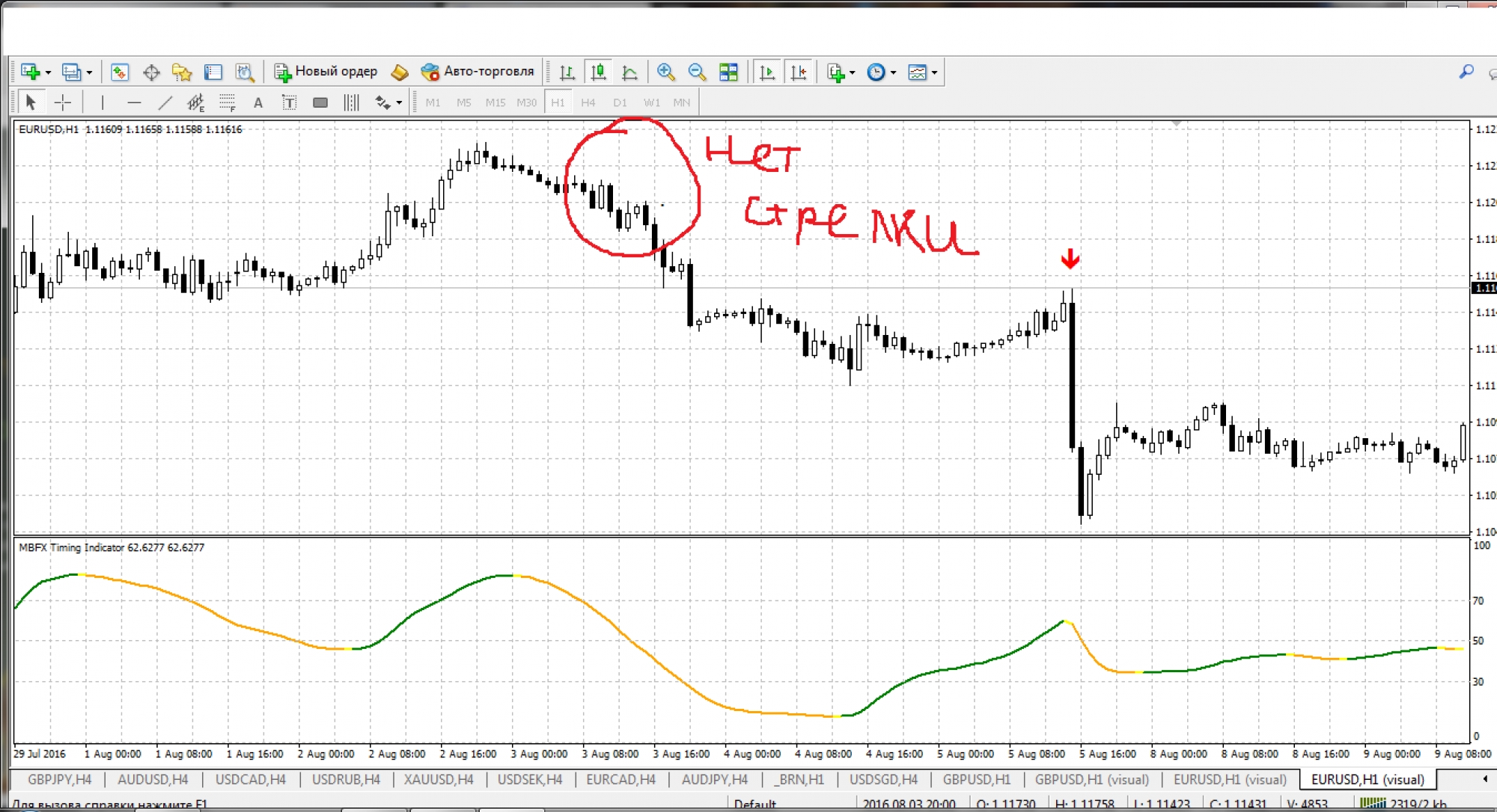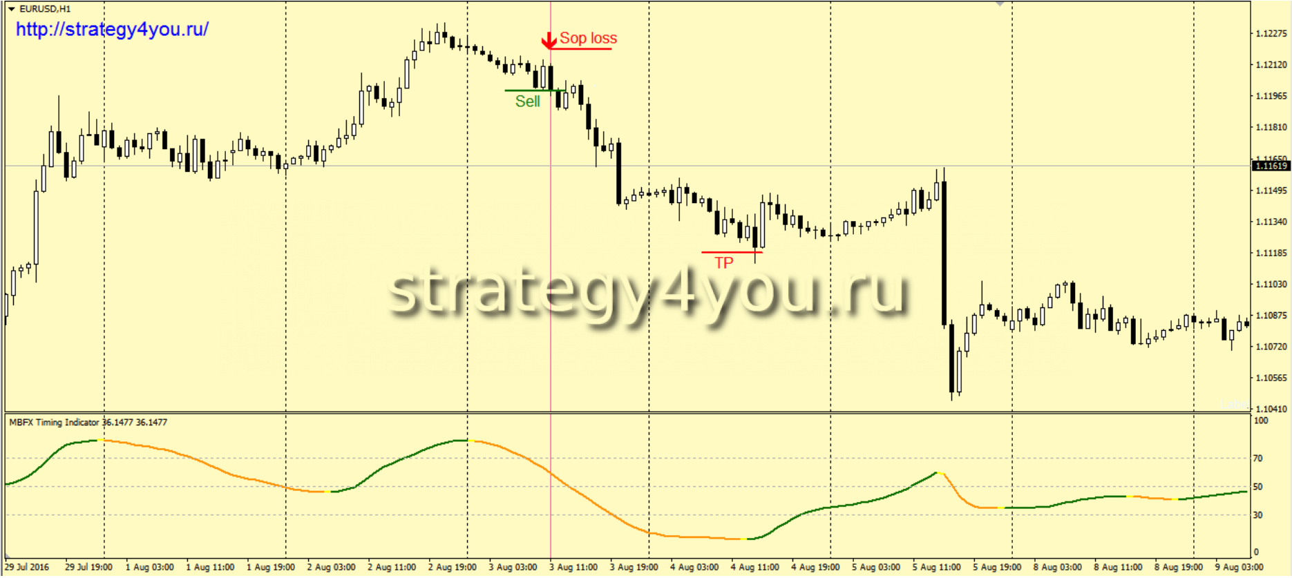 2) В этот же момент следует обратить внимание на индикатор MBFX Timing. Если он направлен вниз и окрашен в оранжевый цвет — на открытии следующей H1 свечи заключается сделка на продажу.