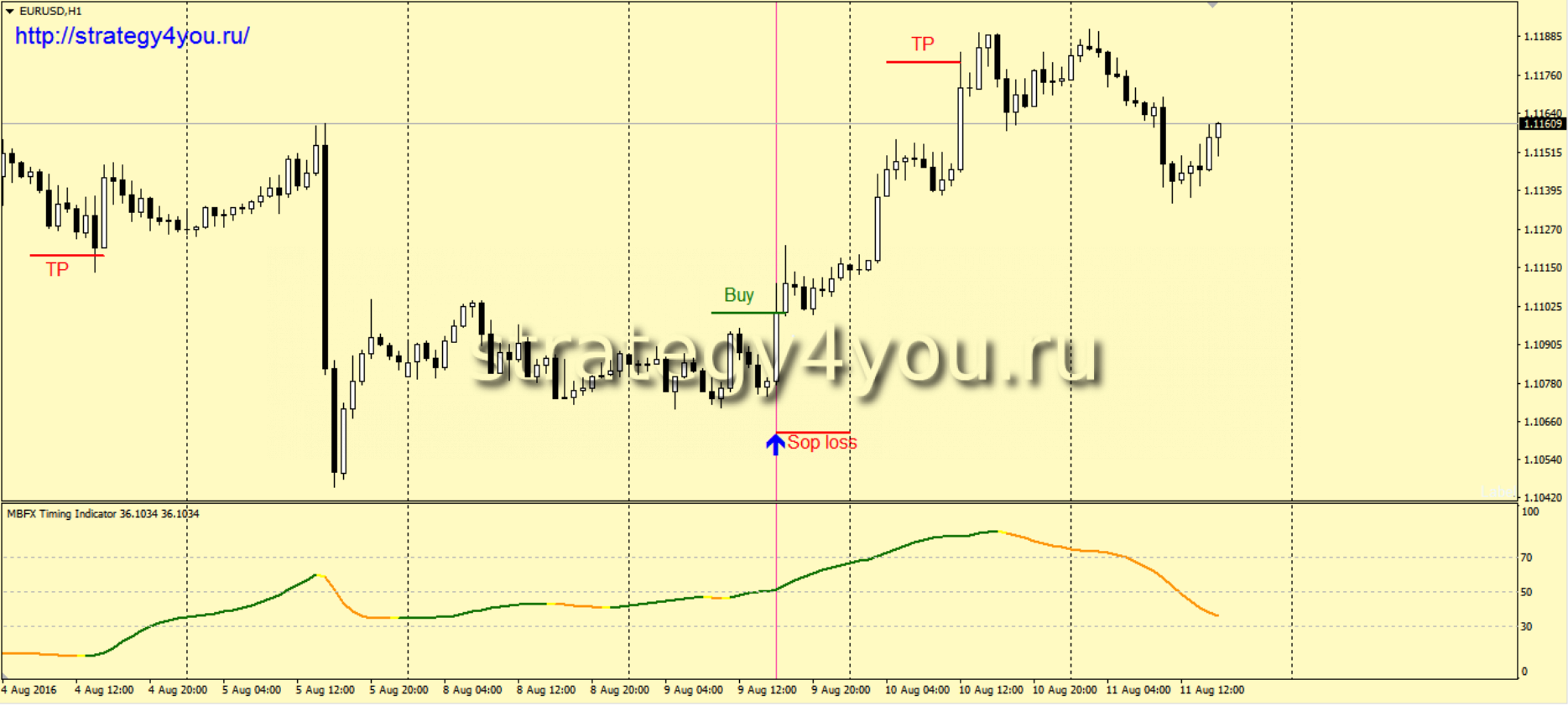 2) В этот же момент следует обратить внимание на индикатор MBFX Timing. Если он направлен вверх и окрашен в зеленый цвет, то на открытии следующей свечи заключается сделка на покупку.