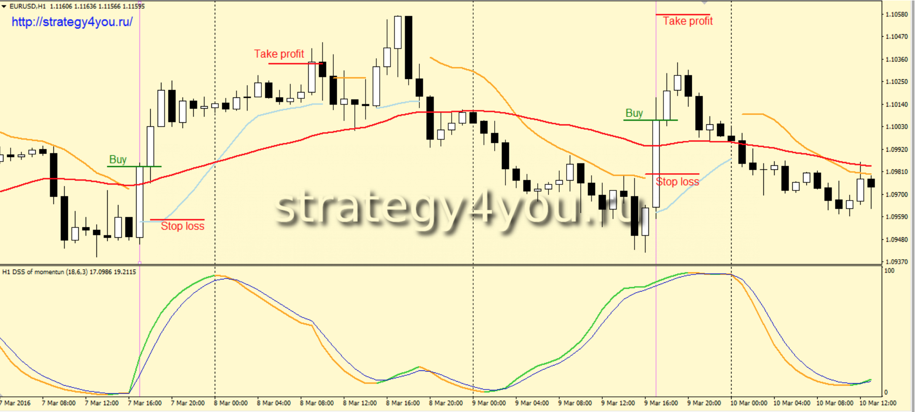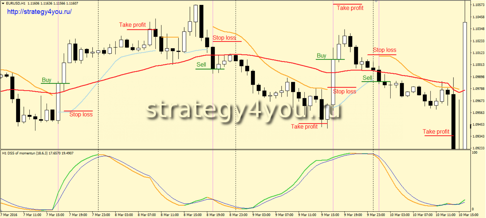 3) Основная линия индикатора DSS of momentum окрашена в оранжевый цвет и находится ниже сигнальной линии. Если это условие не выполнено на первой свече, на которой мы получили сигнал от индикатора Trend Envelopes, то данный сигнал игнорируется вне зависимости от сигналов уже на второй свече.