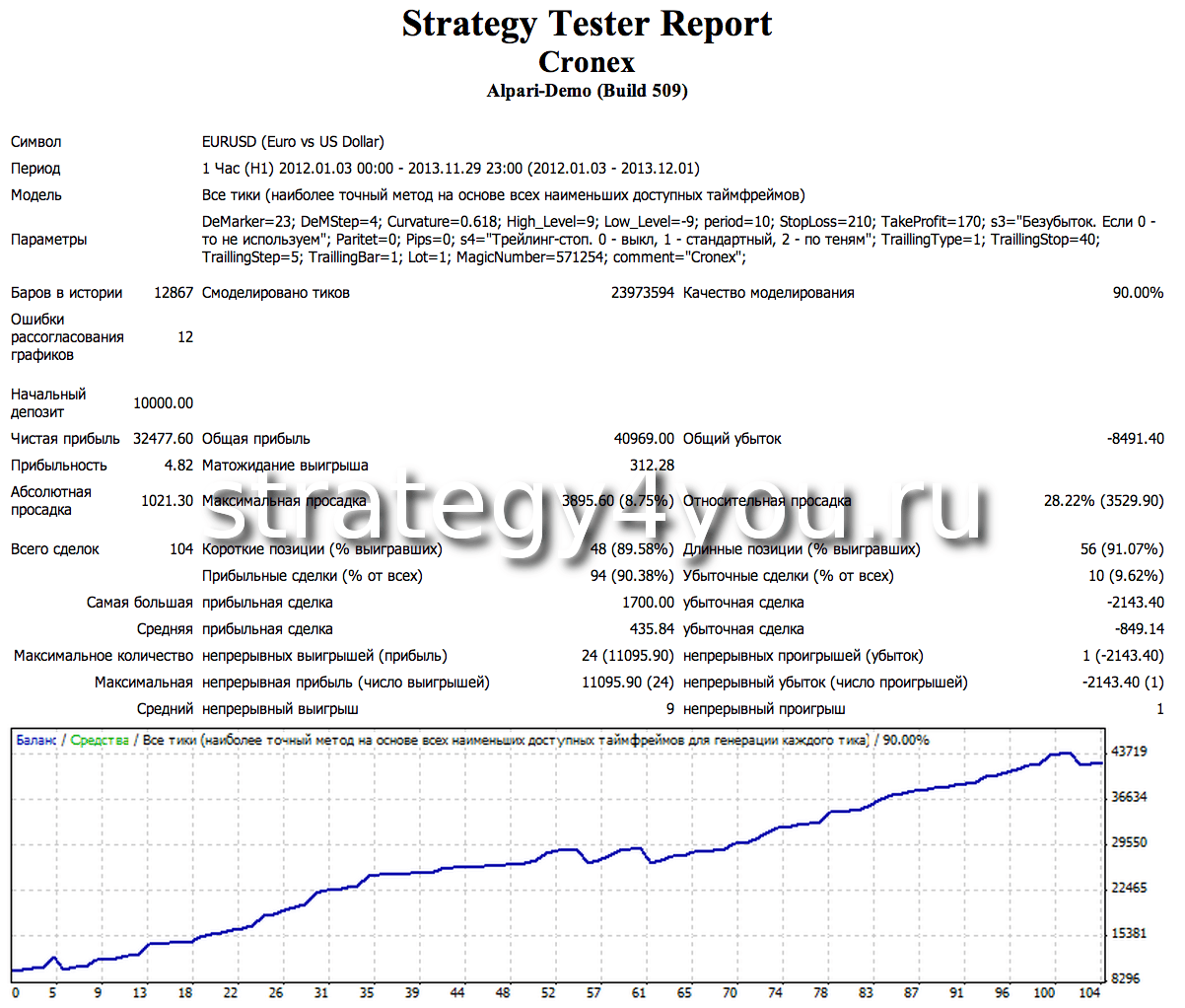Стратегия форекс Cronex является мультивалютной и может быть применена ко всем валютным парам, а так же временным интервалам, однако рекомендуется использовать все-таки временной интервал 4 часа (4Н), а так же ниже вы найдете отчеты и советник к валютной паре EURUSD (H1 и M15).
