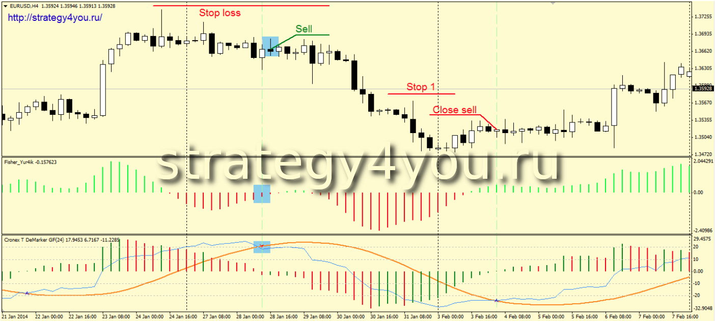 5) Так же следует закрыть сделку в случае пересечения желтой и синей линий на индикаторе Cronex T DeMarker Gf в обратную сторону ниже нулевой отметки.