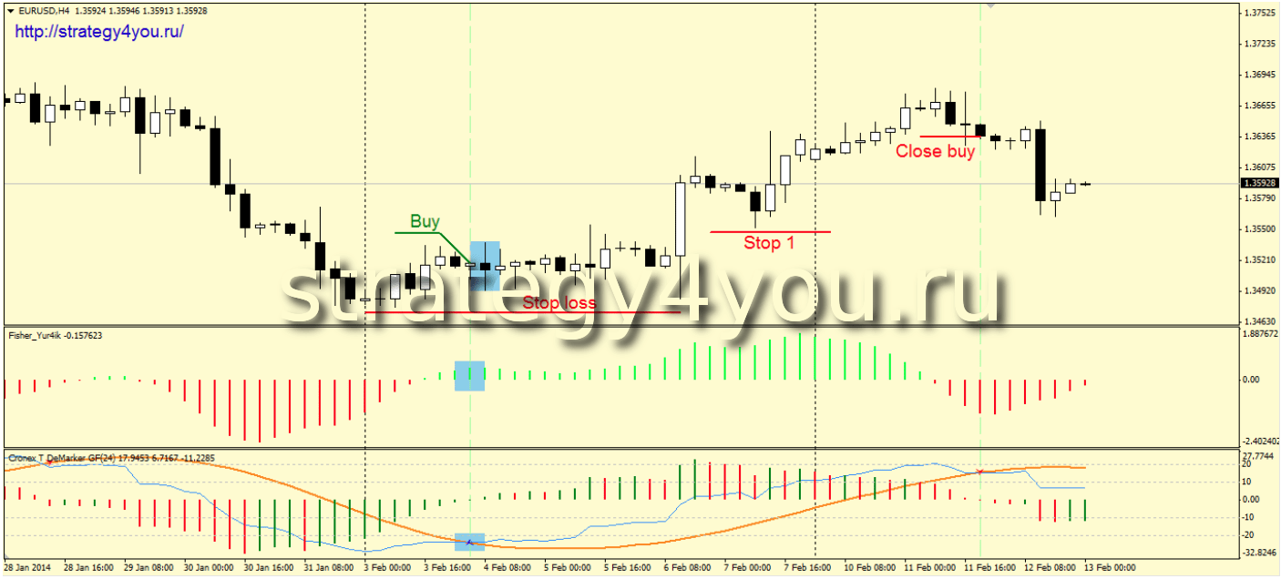 2) Индикатор Fisher_Yur4ik пересекает свою нулевую отметку снизу вверх и меняет цвет с красного на зелёный.