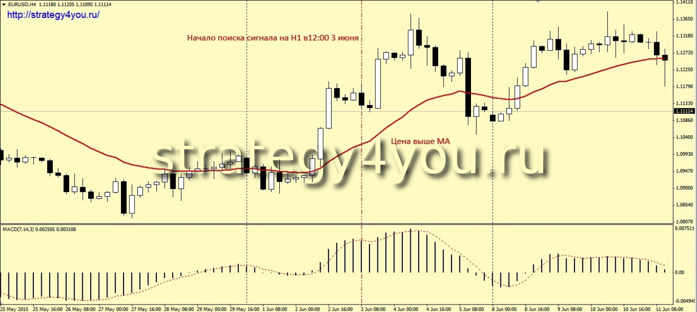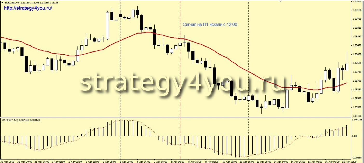 2) Индикатор MACD находится ниже своей нулевой отметки. Как только соответствующее последней закрытой свече значение индикатора оказывается выше своей сигнальной линии, следует перейти на H1 интервал для определения точки входа в рынок.