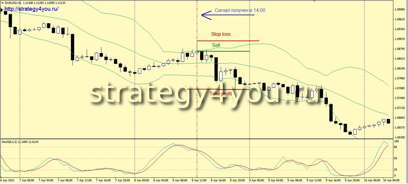 4) На индикаторе Stochastic произошло пересечение 2-х линий, то есть его сигнальная линия находится ниже основной. Так же сам индикатор должен либо находиться в зоне перекупленности, либо не давно вышел из неё.
