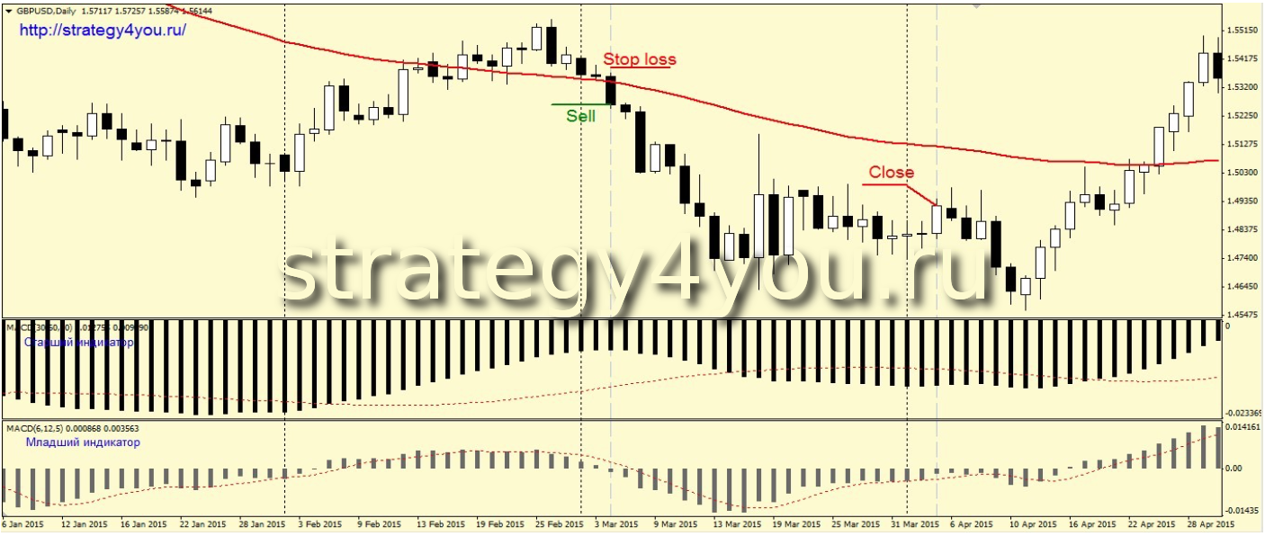 4) После выполнения всех условий, на открытии следующей дневной свечи, следует заключить сделку на продажу.