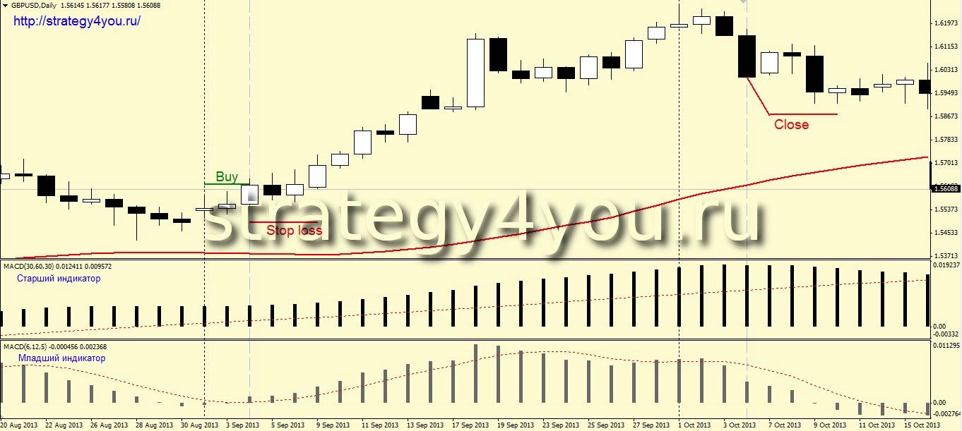 6) Сделка закрывается по старшему MACD. После входа в рынок ждем, когда этот индикатор начнет расти и уже только после первого роста, ждем первой свечи, на которой индикатор начнет снижаться. На закрытии именно этой свечи следует закрывать сделку.
