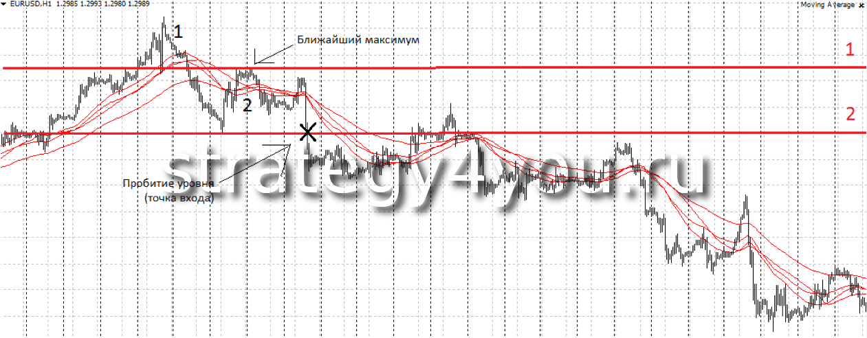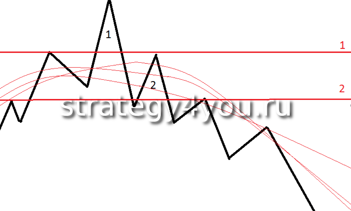 Скажем, был восходящий тренд. У нас появился первый максимум (цифра 1). За ним появился второй максимум (цифра 2) , который отбился от уровня сопротивления (красная цифра 1) и пробил уровень поддержки (красная цифра 2). Сразу, после закрытия свечи после пробития, выставляем ордер на продажу и выставляем стоп лосс на второй максимум.