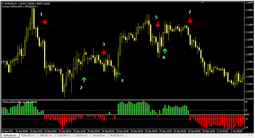 - FxSpro-WPR — является осциллятором и дает подтверждение о смене ТРЕНДА (применяется для подтверждения возникновения новых тенденций).