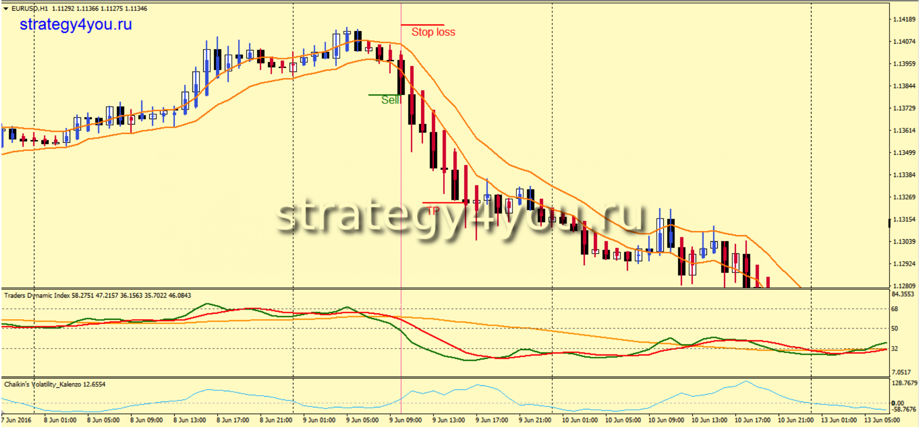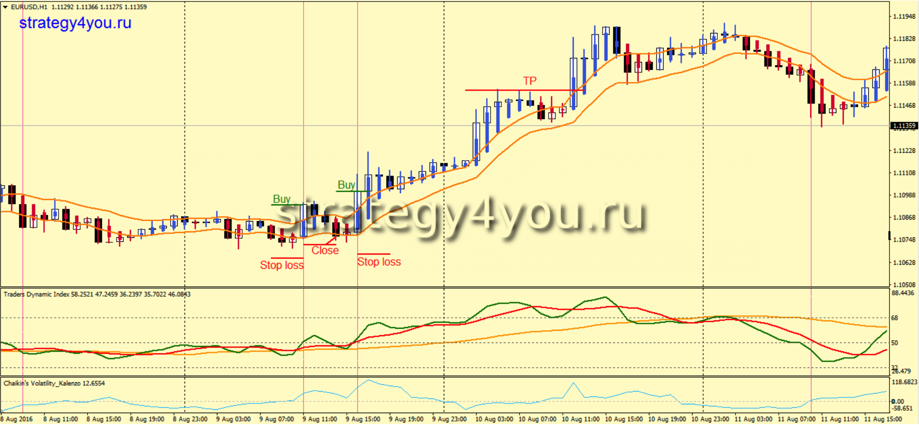 2) Если все сигналы получены, а индикатор Chaikin’s Volatility_Kalenzo показывает снижение, то данный сигнал игнорируется и уже больше не рассматривается в дальнейшем.